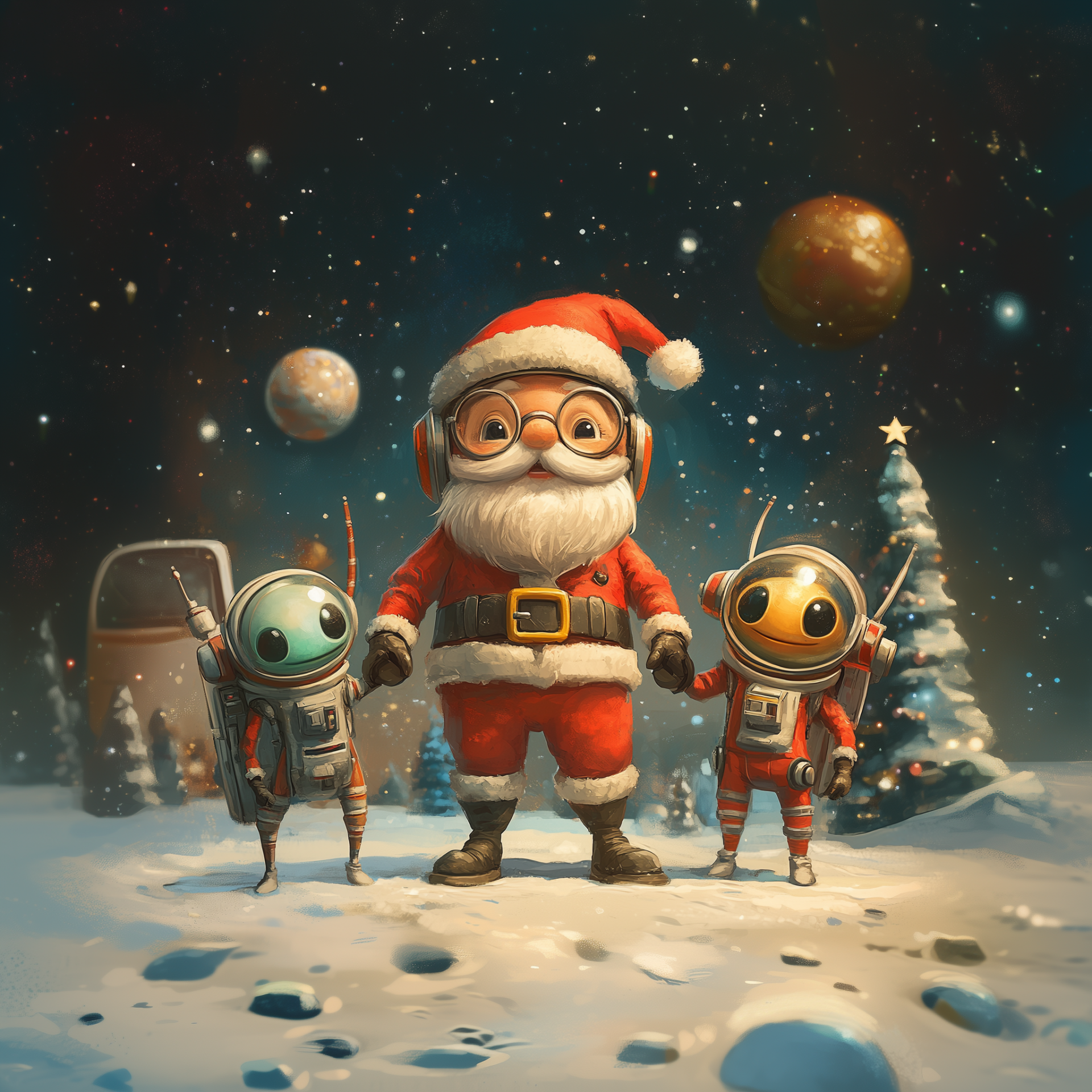 The illustration features Santa Claus joyfully holding hands with adorable aliens in colorful spacesuits. The scene captures a whimsical Christmas theme, filled with vibrant colors and a fun, playful atmosphere reminiscent of animated films.
