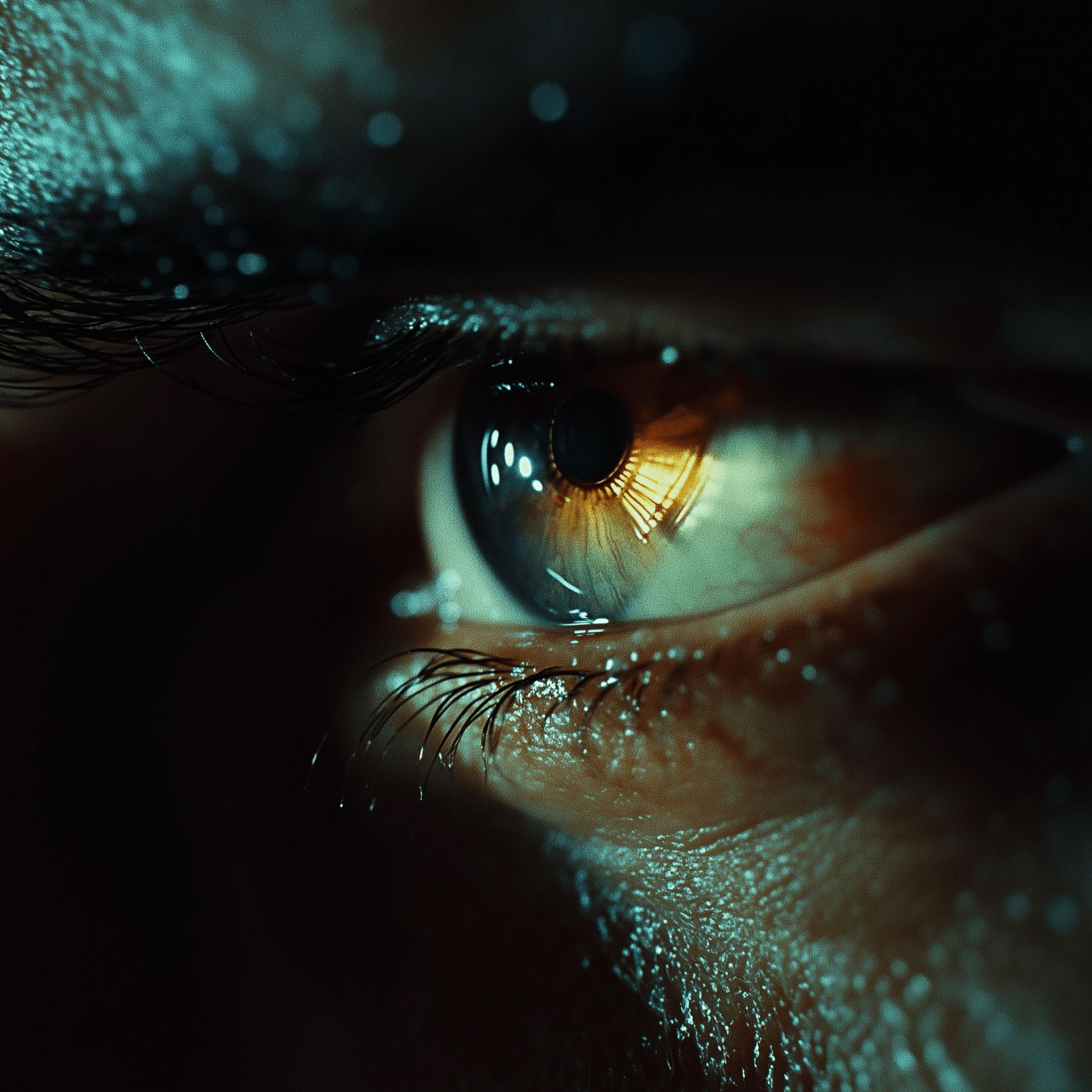 A striking close-up of a man's eye set against a dark background. The reflection of a light source glimmers in the eye, creating an evocative and cinematic atmosphere.