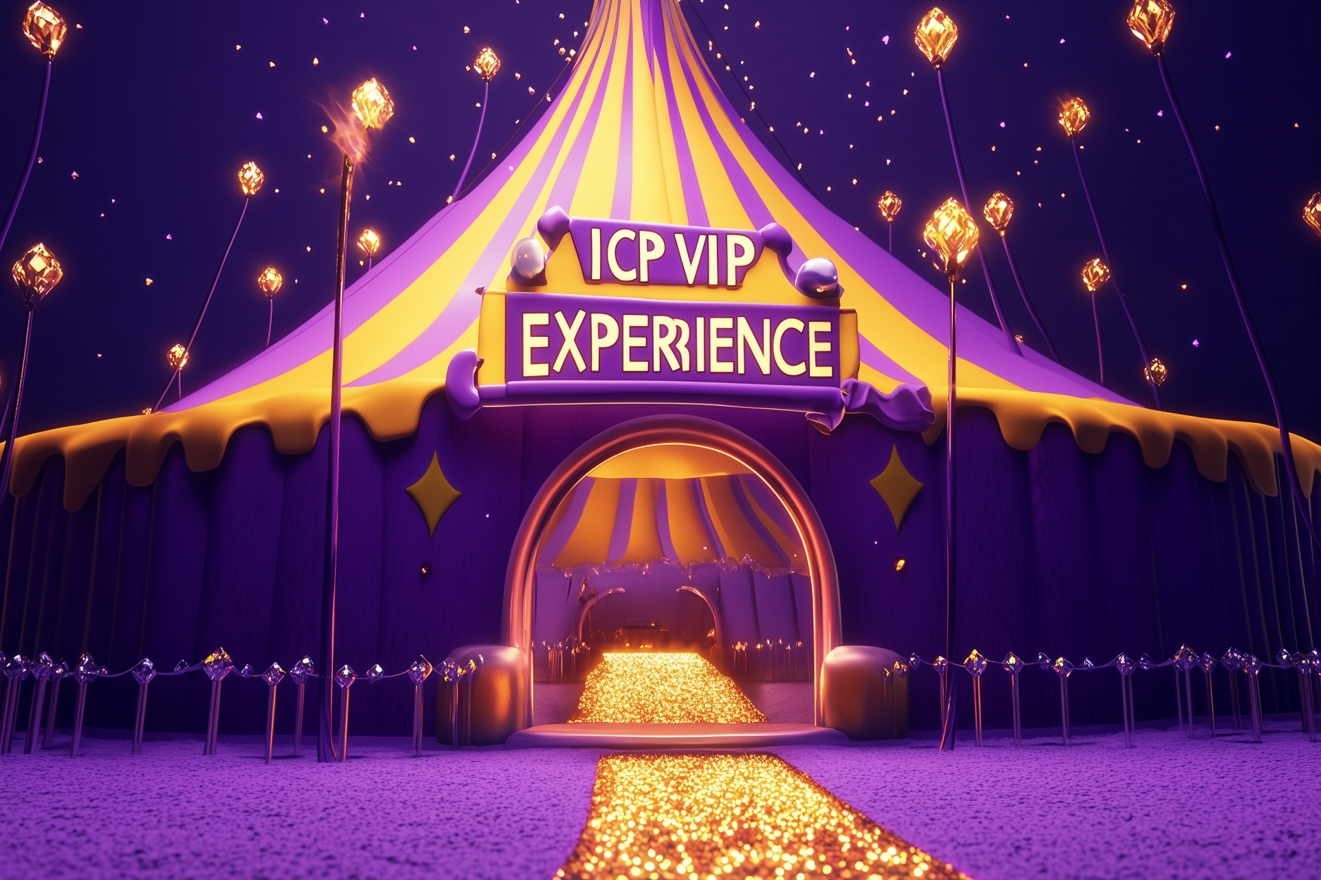 The image captures a whimsical CGI animated scene featuring a vibrant purple and yellow circus tent with a slightly ajar entrance. A warm golden glow radiates from within, creating a magical atmosphere as shimmering diamonds lead the way to the tent's opening.