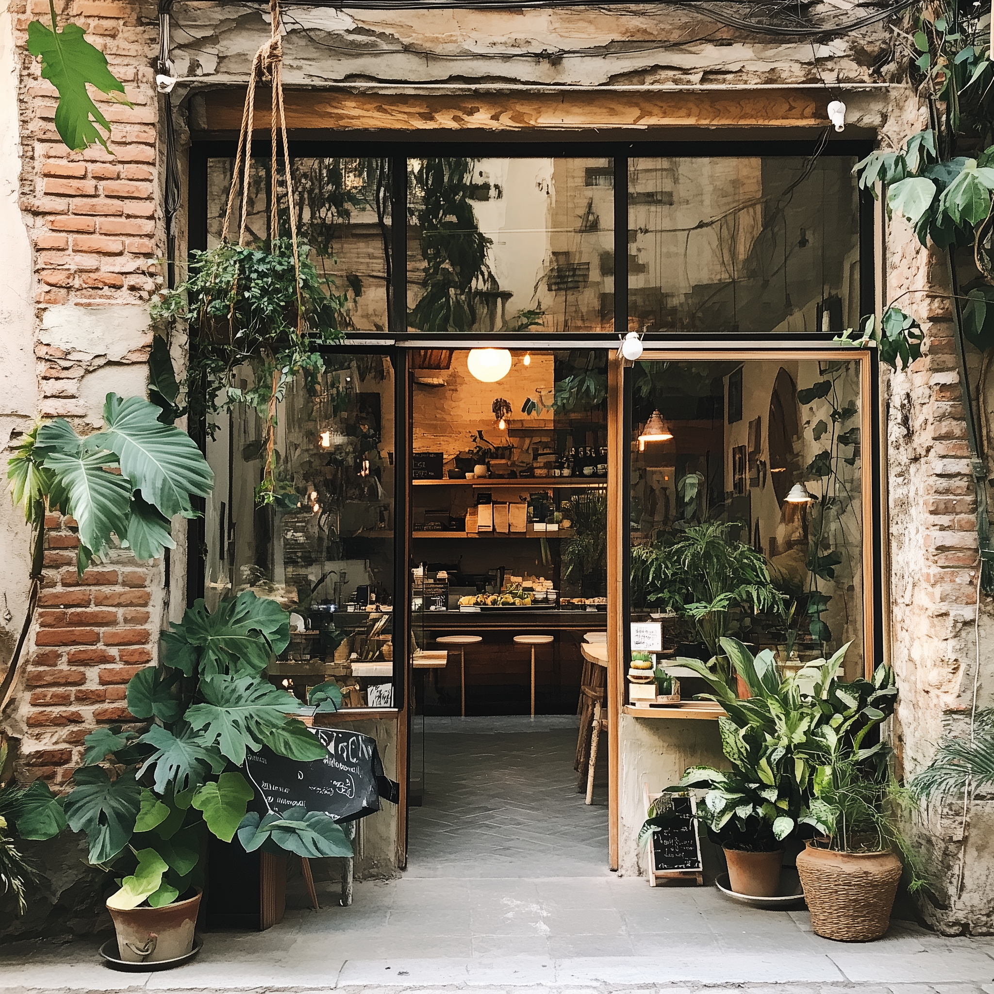 This image showcases a cozy brunch setting on a sidewalk, capturing the vibrant atmosphere of a lively city. Lush plants and rustic wooden elements blend harmoniously with the warm-toned bricks, creating an inviting outdoor dining experience.
