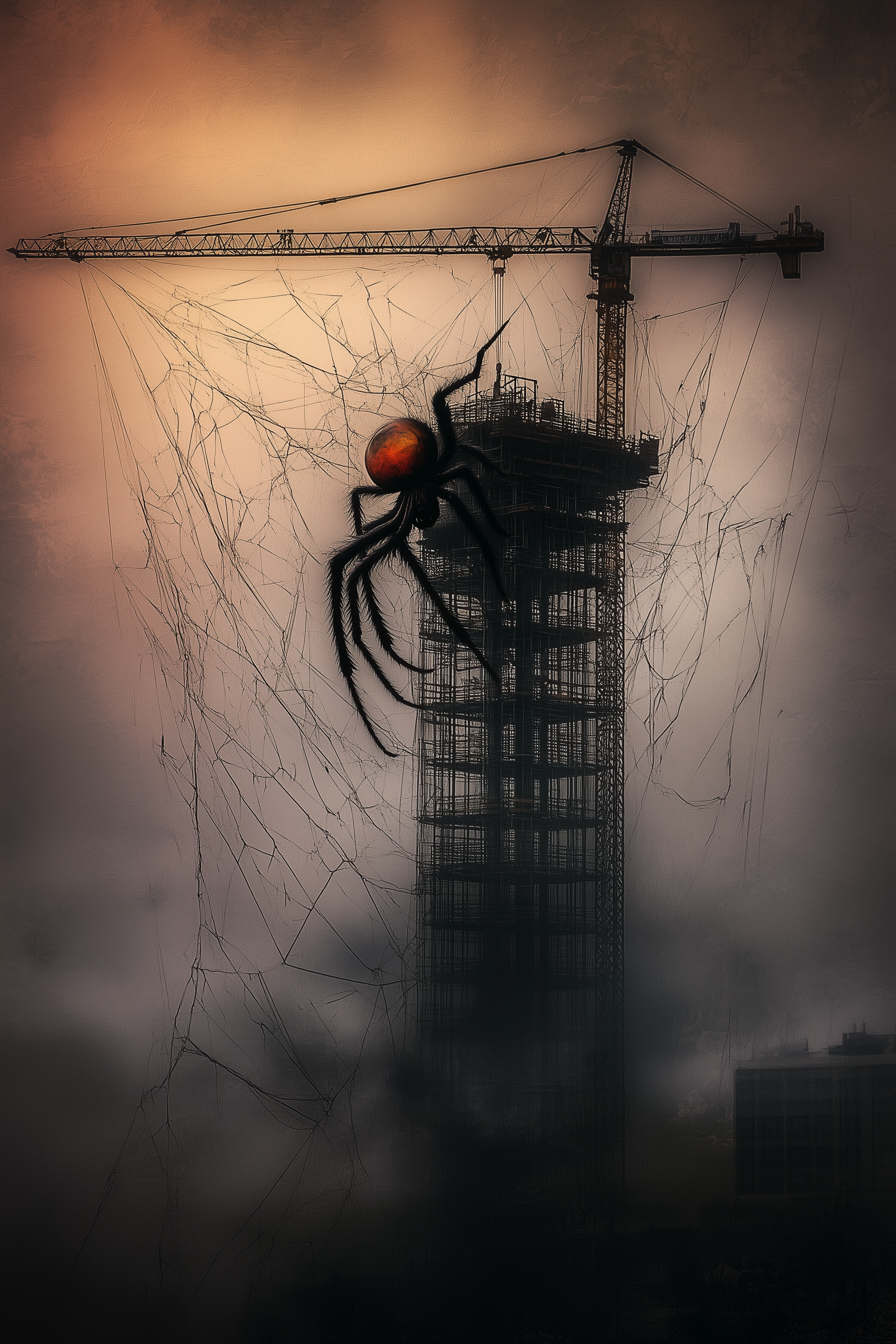 A surreal photo capturing a gigantic and colorful spider hanging from a construction crane amidst a vibrant cityscape. The intricate spider web adds a touch of mystery and intrigue to the scene.