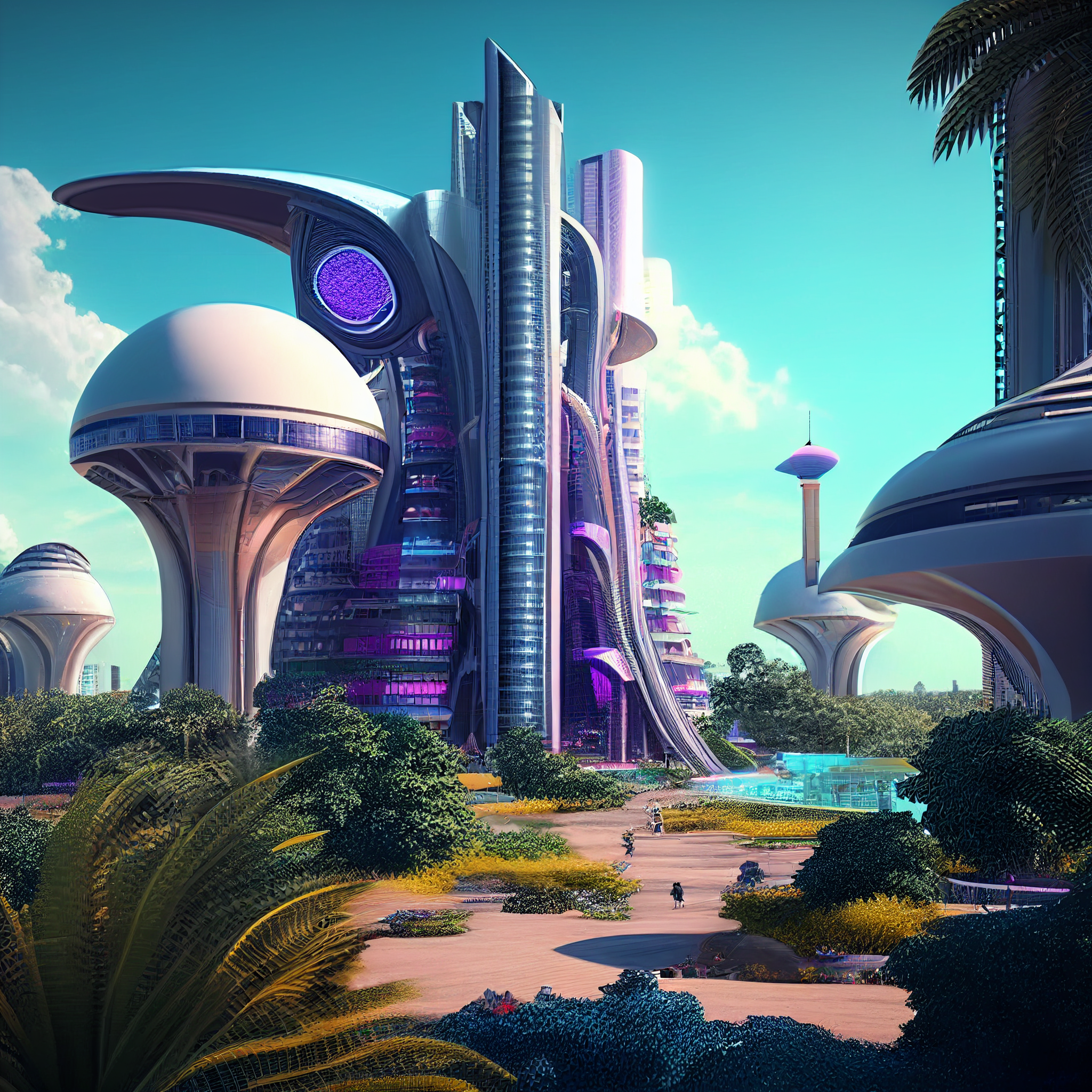 The image showcases a vibrant city filled with colorful futuristic buildings that rise majestically against the sky. A lively scene unfolds in a nearby park, capturing the essence of a modern urban environment where nature meets innovative architecture.