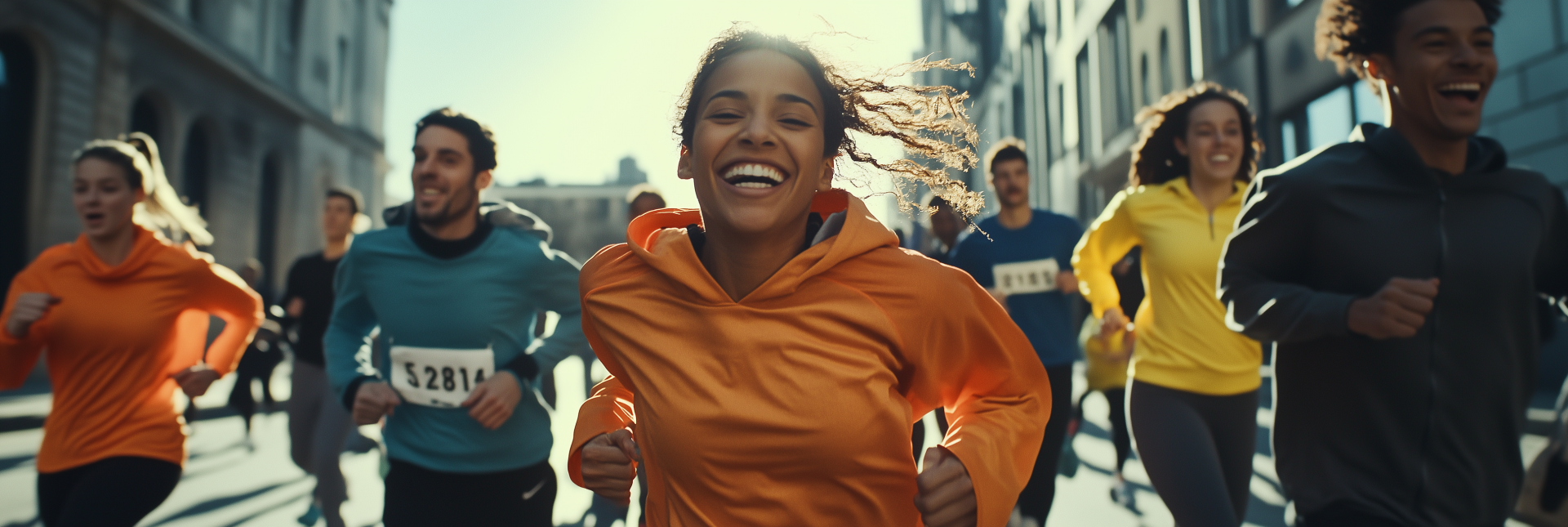This photorealistic image captures a sunny day filled with a diverse group of runners training on a bustling city road. The scene is vibrant and full of energy, showcasing the joy and camaraderie as they smile and encourage one another while running.