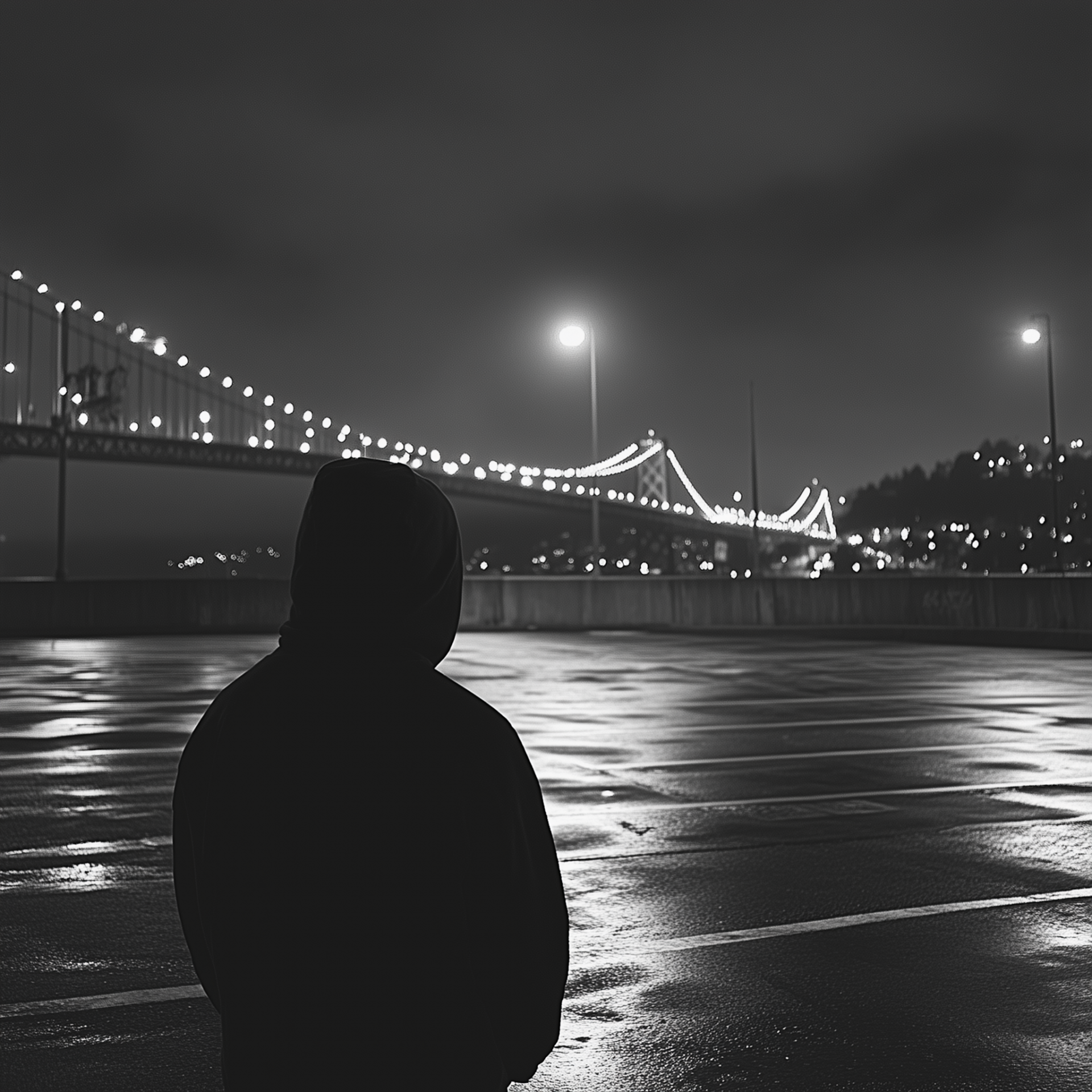 This high-detail black and white photo captures a solitary figure in a hoodie viewed from behind, standing on an empty parking lot. The image conveys a melancholic vibe as city lights shimmer in the background under a large bridge.