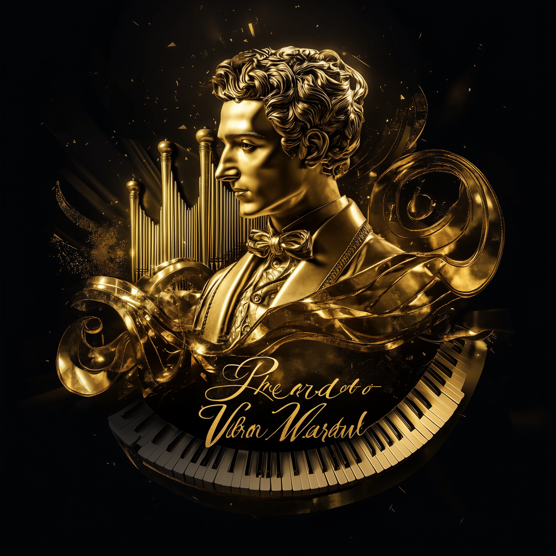 This image features a majestic 3D logo that emphasizes elegance and sophistication. The golden elements against a dark background create a striking contrast, evoking a sense of grandeur reminiscent of classical music venues.