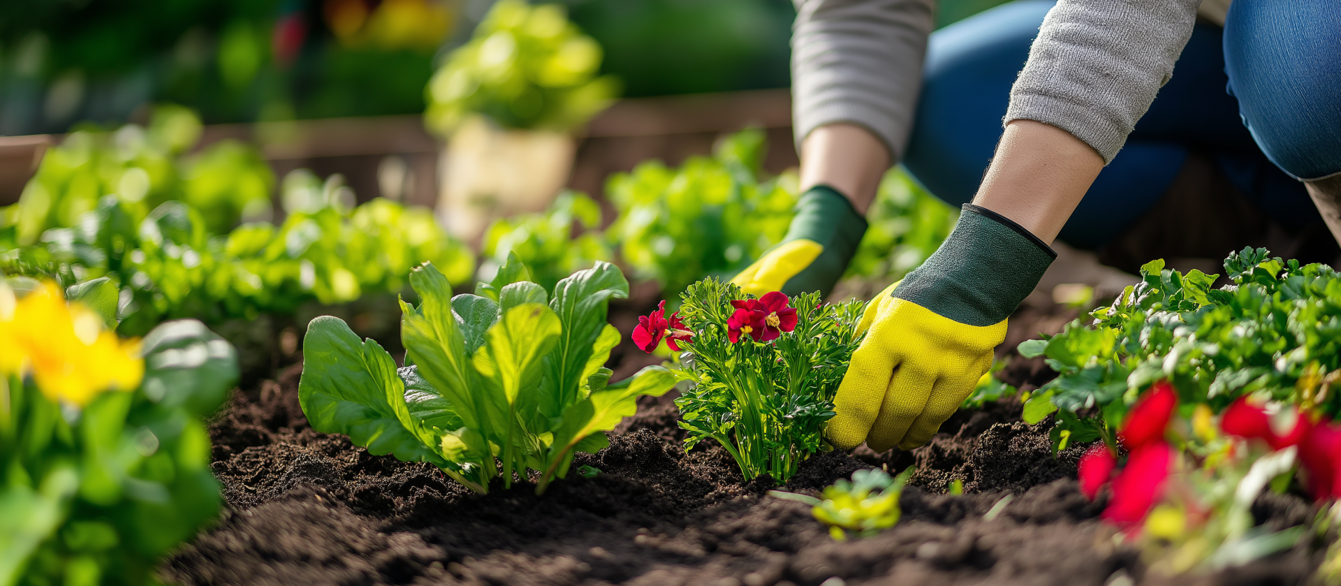 The image showcases a housekeeper dressed in bright yellow gloves and an apron, holding a bucket filled with cleaning supplies. The crisp white background enhances the professional appearance of the scene while adding a vibrant feel with purple tones.