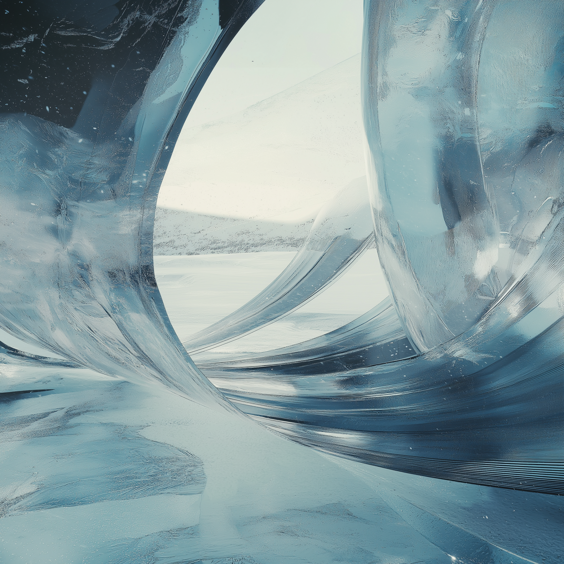 This image features a dreamy, surreal icy landscape with pastel blue, gray, and silver hues. Floating cellophane ribbons twist gracefully through the air, creating a whimsical atmosphere against a backdrop of gently disrupted snowy textures.