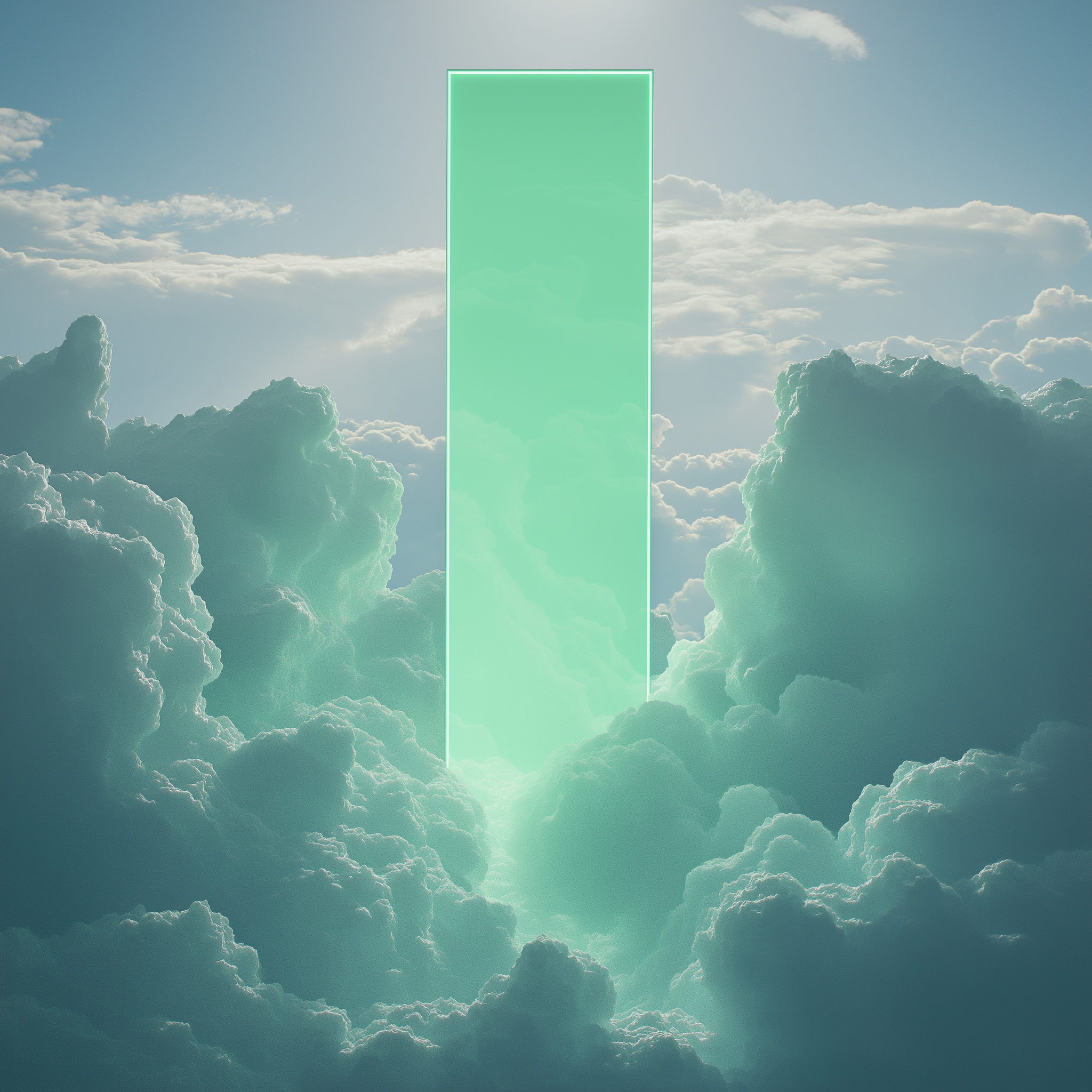 A striking image featuring a solid green rectangle piercing through a serene expanse of soft blue clouds. The contrast between the vibrant green and the calming blue creates a surreal and captivating atmosphere.