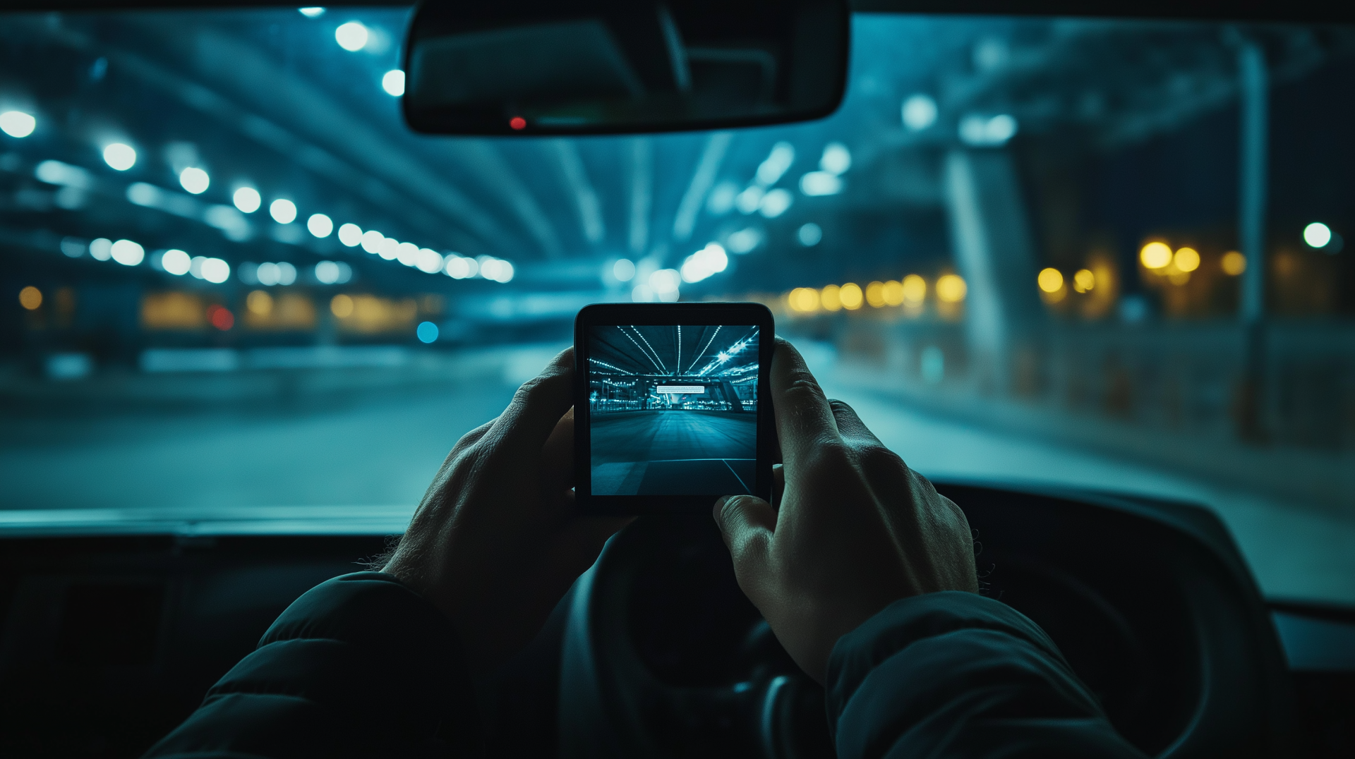 This image captures a close-up view of a coach driver's hands as he holds a cell phone, illuminated by bright fluorescent lights. The cold blue lighting creates a cinematic atmosphere in the spacious parking lot of a stadium, enhancing the details and realism of the scene.