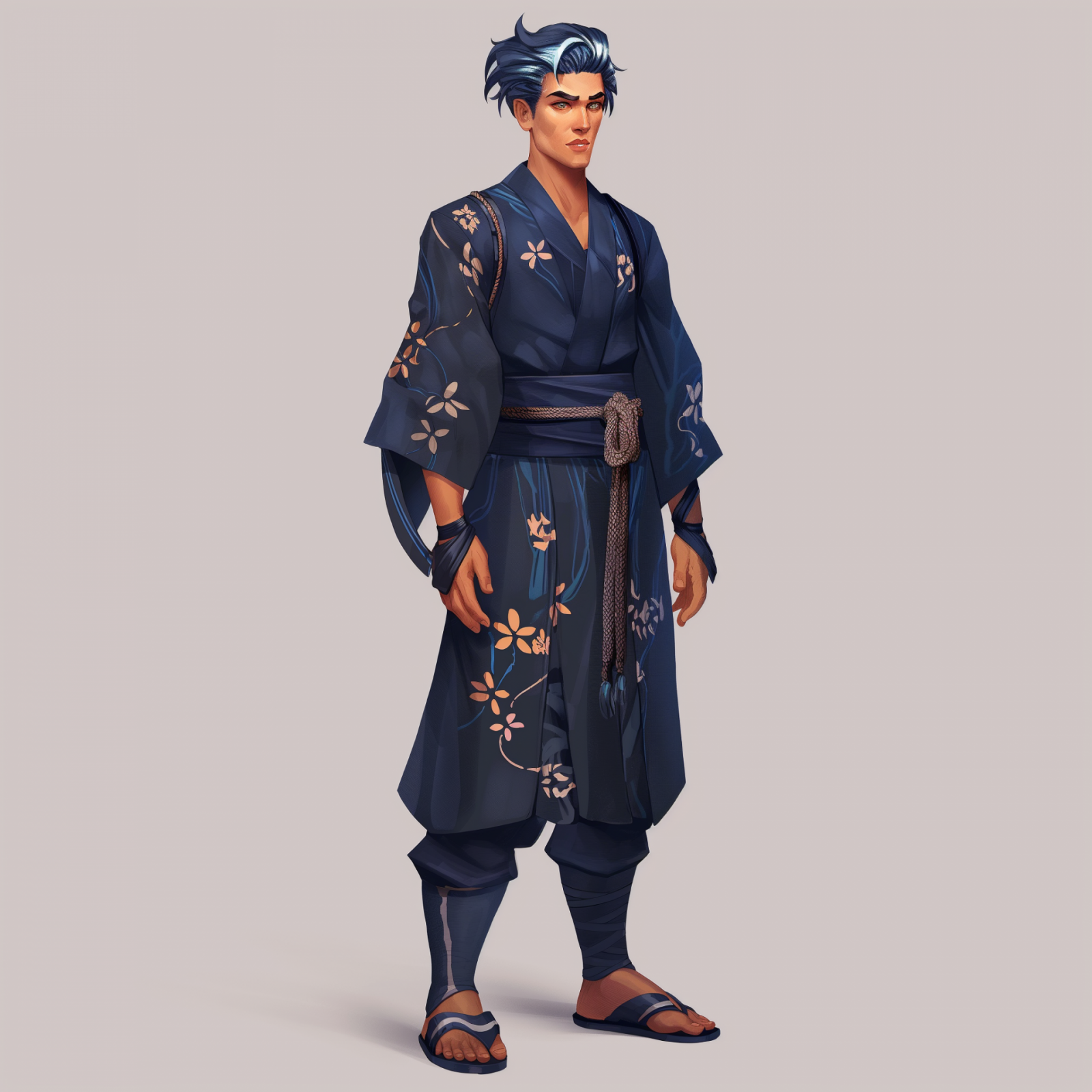 The image features a full body character design of a male figure with striking cobalt hair, dressed in a sleek navy blue tech kimono. The overall style blends futuristic elements with traditional attire, creating a captivating and unique appearance.
