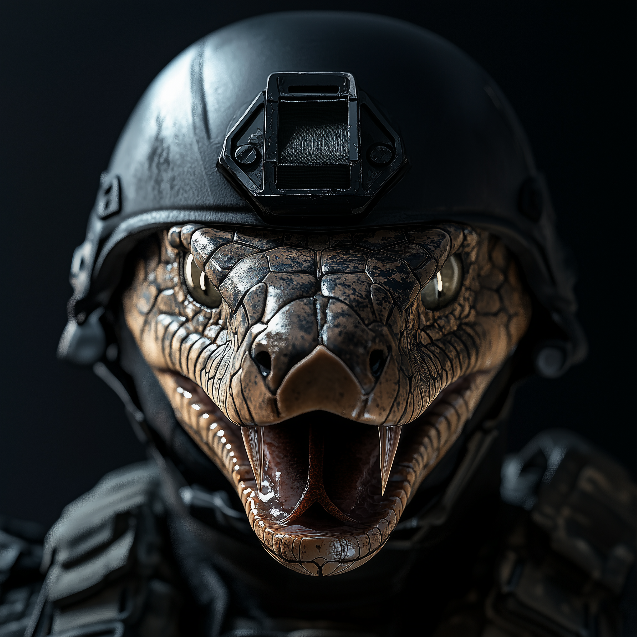The image features an angry cobra with its fangs bared, adorned with a black military tactical helmet. Soft shadows accentuate its fierce expression, giving a dramatic yet captivating vibe.