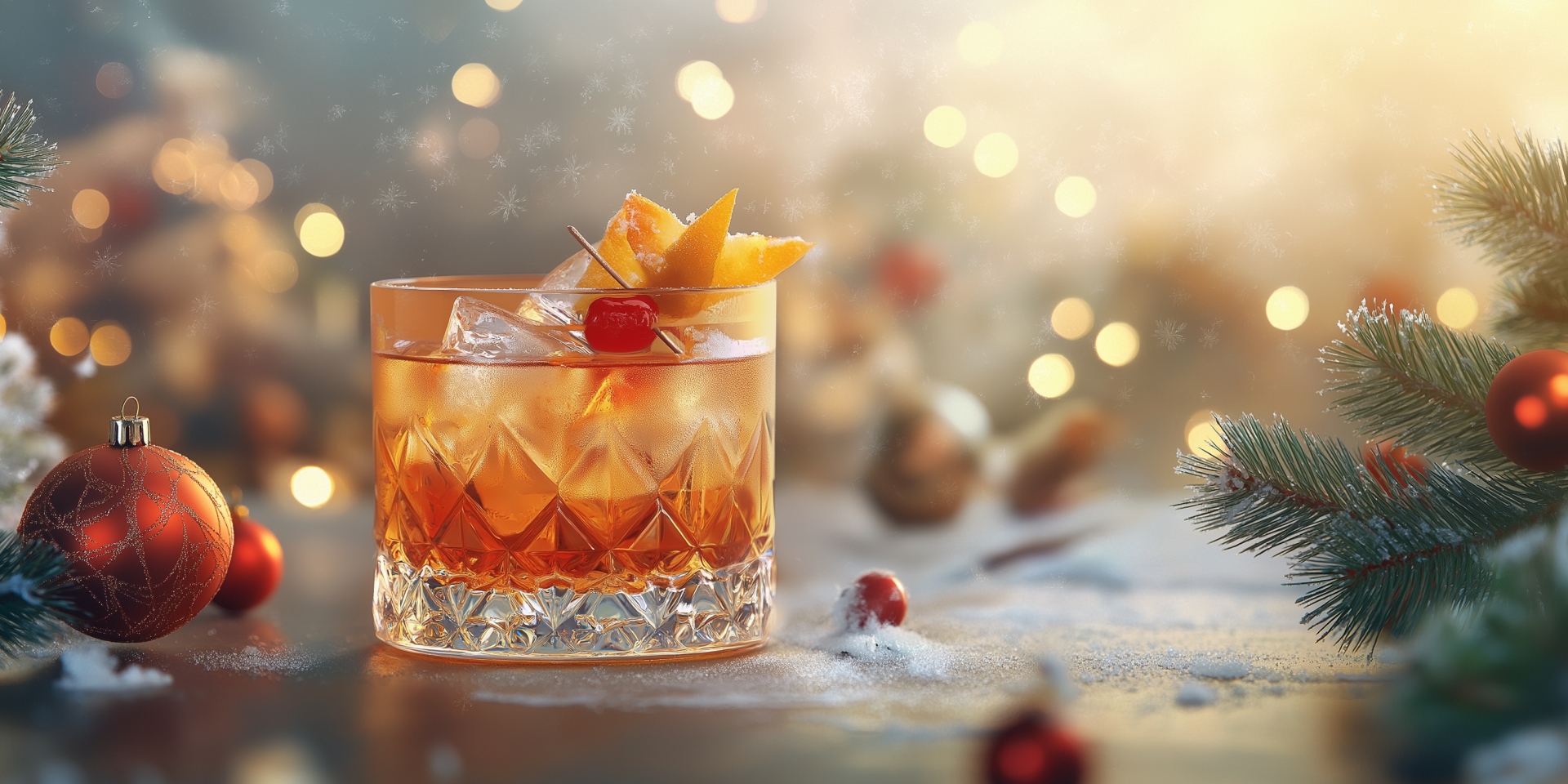 This striking image combines the festive spirit of Christmas with a vibrant display of various cocktails. The clean and surreal style showcases an array of paraphernalia, creating a whimsical yet sophisticated atmosphere.