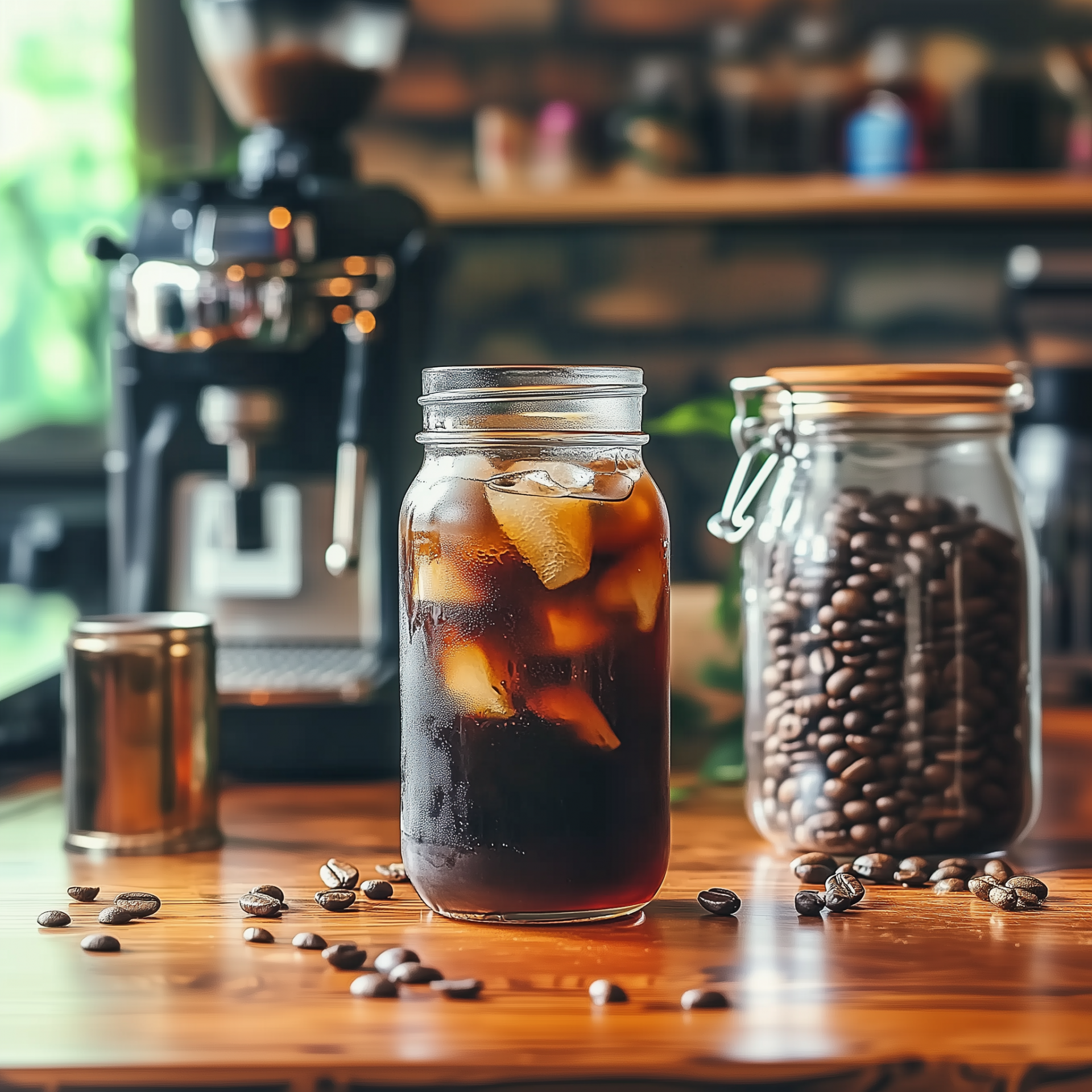 A straight glass jar filled with iced coffee sits prominently on a kitchen counter, surrounded by a coffee machine and a jar of coffee beans. The image is bathed in bright, natural light that highlights the rich details and textures of the scene.