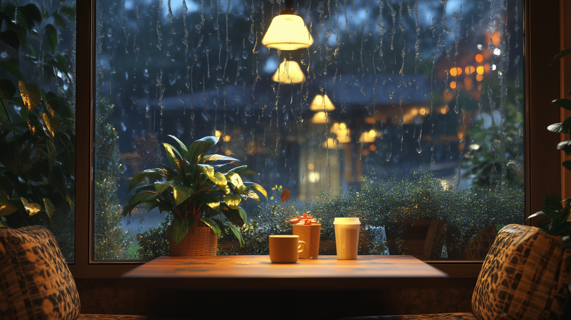 This image captures a cozy coffee shop with a coffee table situated by a large window. The scene is illuminated by soft lighting, creating a warm atmosphere after a rain shower at night, with a glimpse of a garden visible outside.