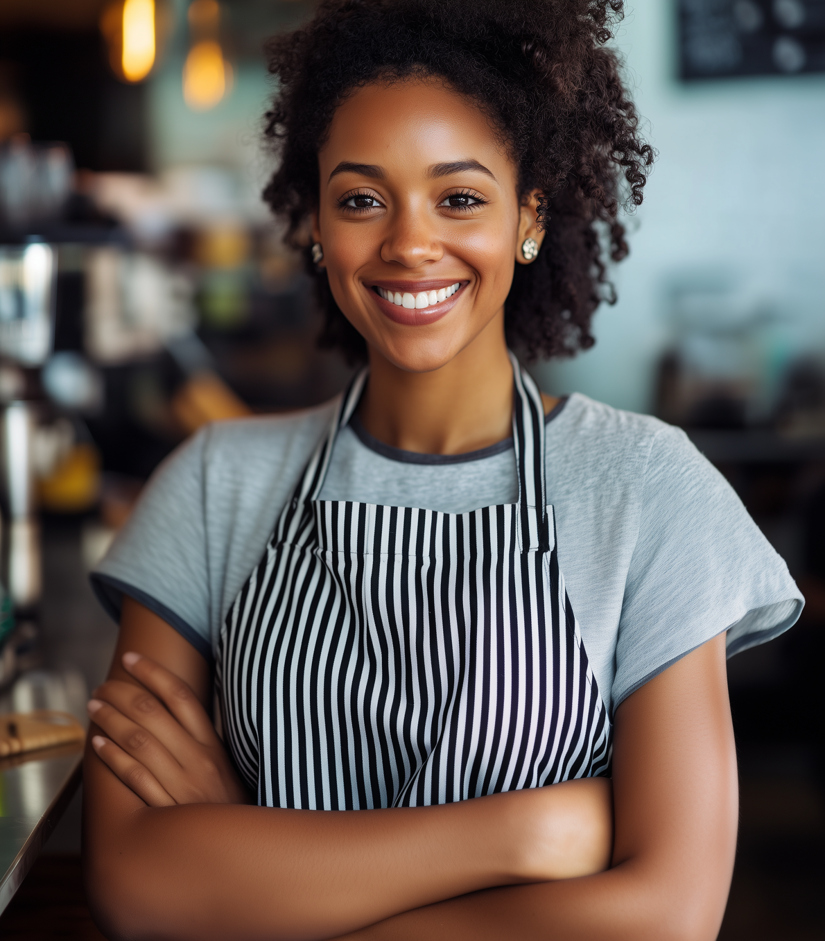 This image features a joyful barista with curly hair, dressed in a striped apron, exuding warmth and friendliness. Soft, natural light enhances the ambiance of the coffee shop, highlighting her smile against a beautifully blurred background.