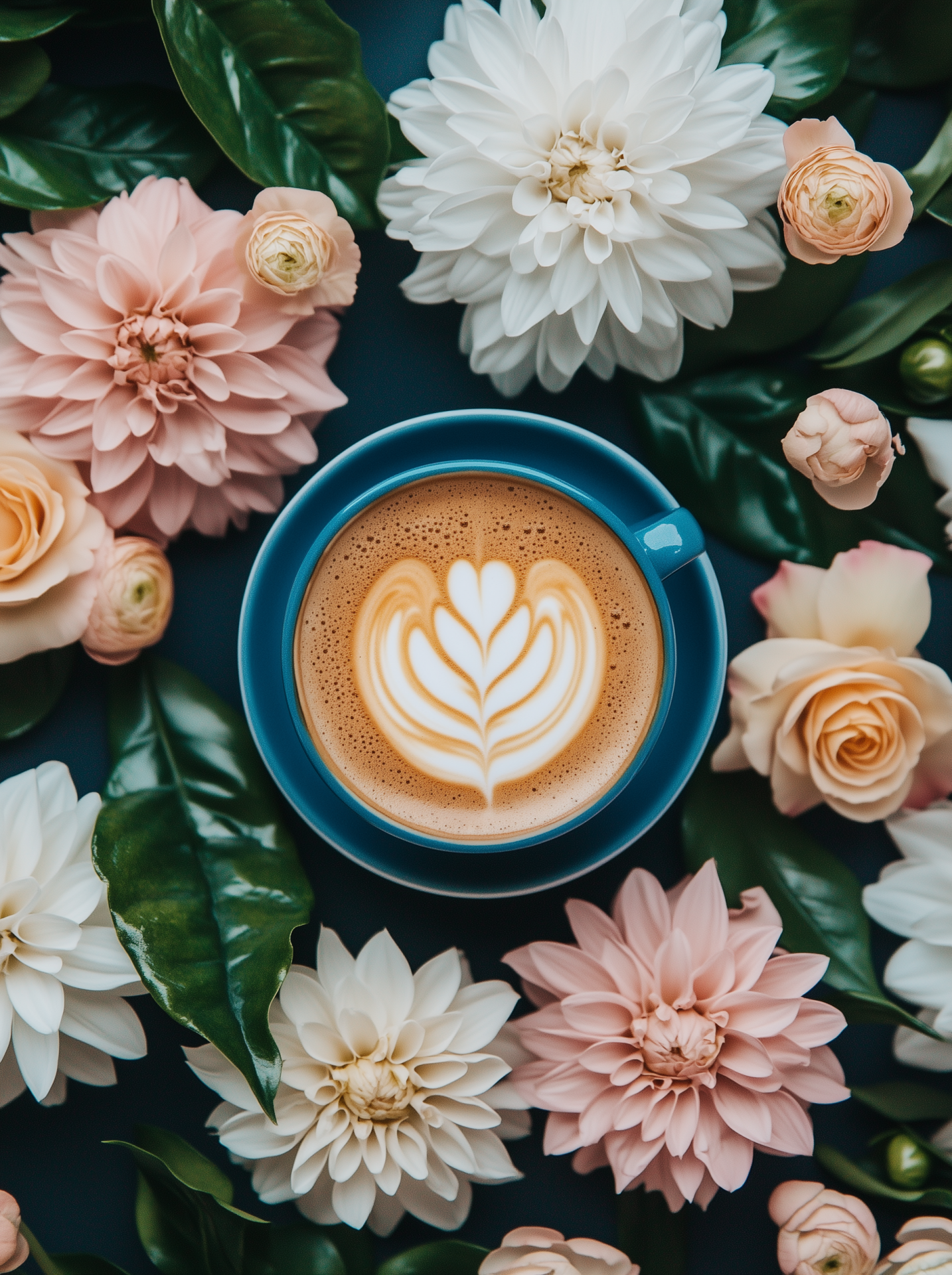 The image captures a cozy scene of a cappuccino placed in a blue cup, beautifully surrounded by delicate white and pink flowers. Viewed from above, it evokes a sense of tranquility and warmth, inviting the viewer to indulge in a peaceful moment.