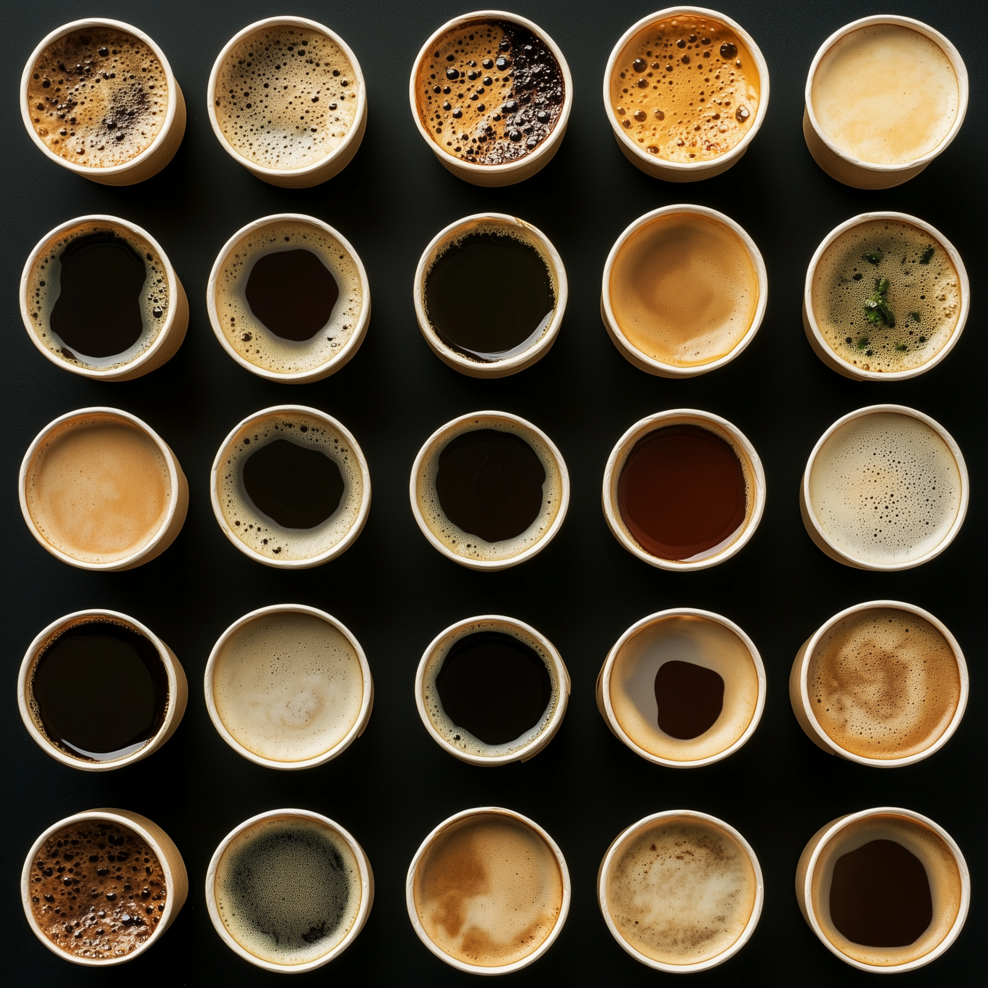 The image captures an overhead view of numerous steaming coffee cups neatly arranged in a grid pattern. The warm steam rising from the cups creates a cozy and inviting atmosphere.