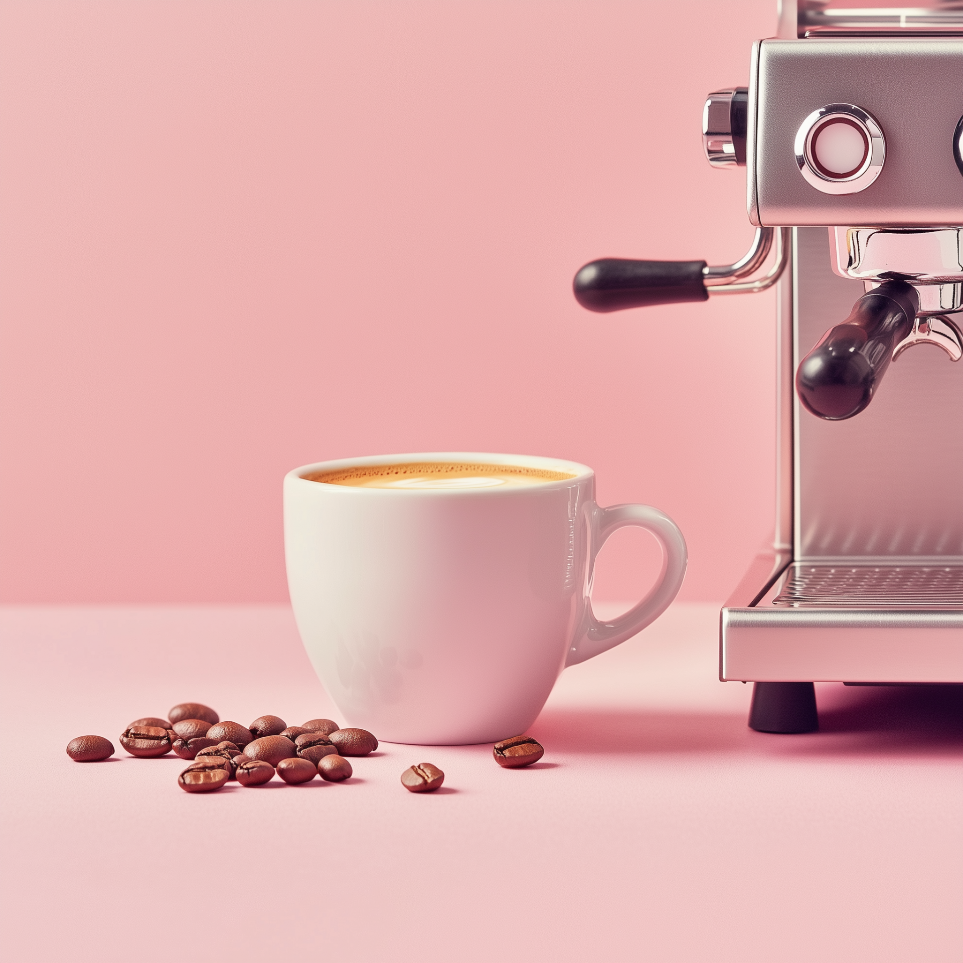 This image features a minimalist pink pastel background highlighting a coffee cup surrounded by espresso beans. A sleek espresso machine is positioned beside the cup, creating a well-composed and serene coffee-themed scene.