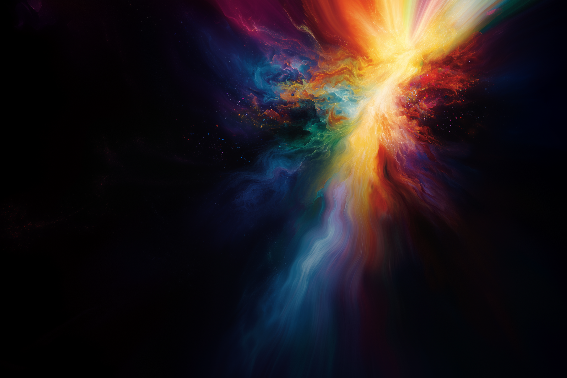 This image presents an abstract vision of vibrant colors flowing downward like liquid into an undefined space. The warm and cool tones shimmer together, creating an ethereal glow that enhances the feeling of depth and dimension.