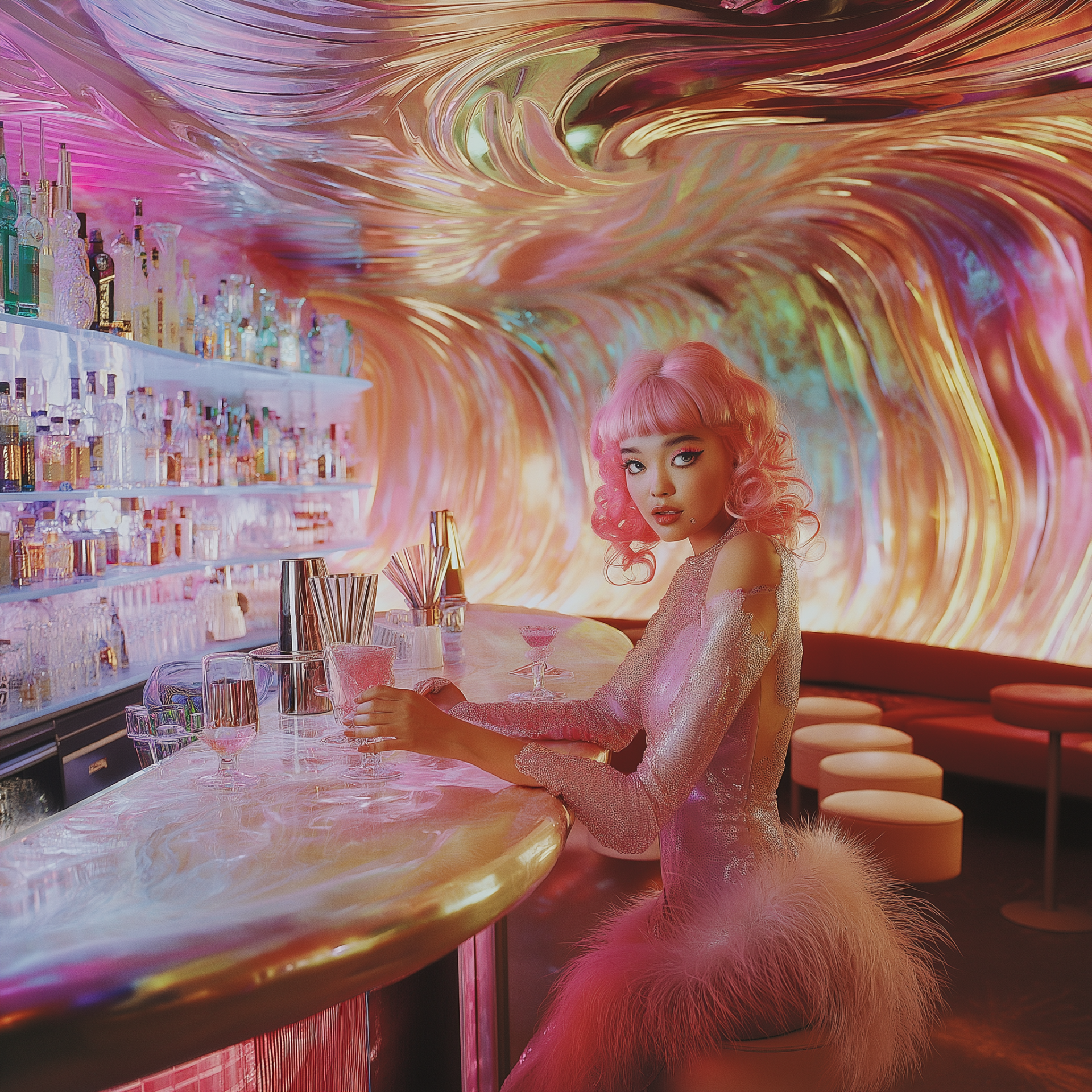 This illustration features a stylish anthropomorphic deer character resembling Bambi, creatively portrayed as a bartender in a vibrant cyberpunk setting. The backdrop reflects a dazzling 1980s Las Vegas aesthetic, filled with elegant rococo motifs and whimsical cotton candy colors.