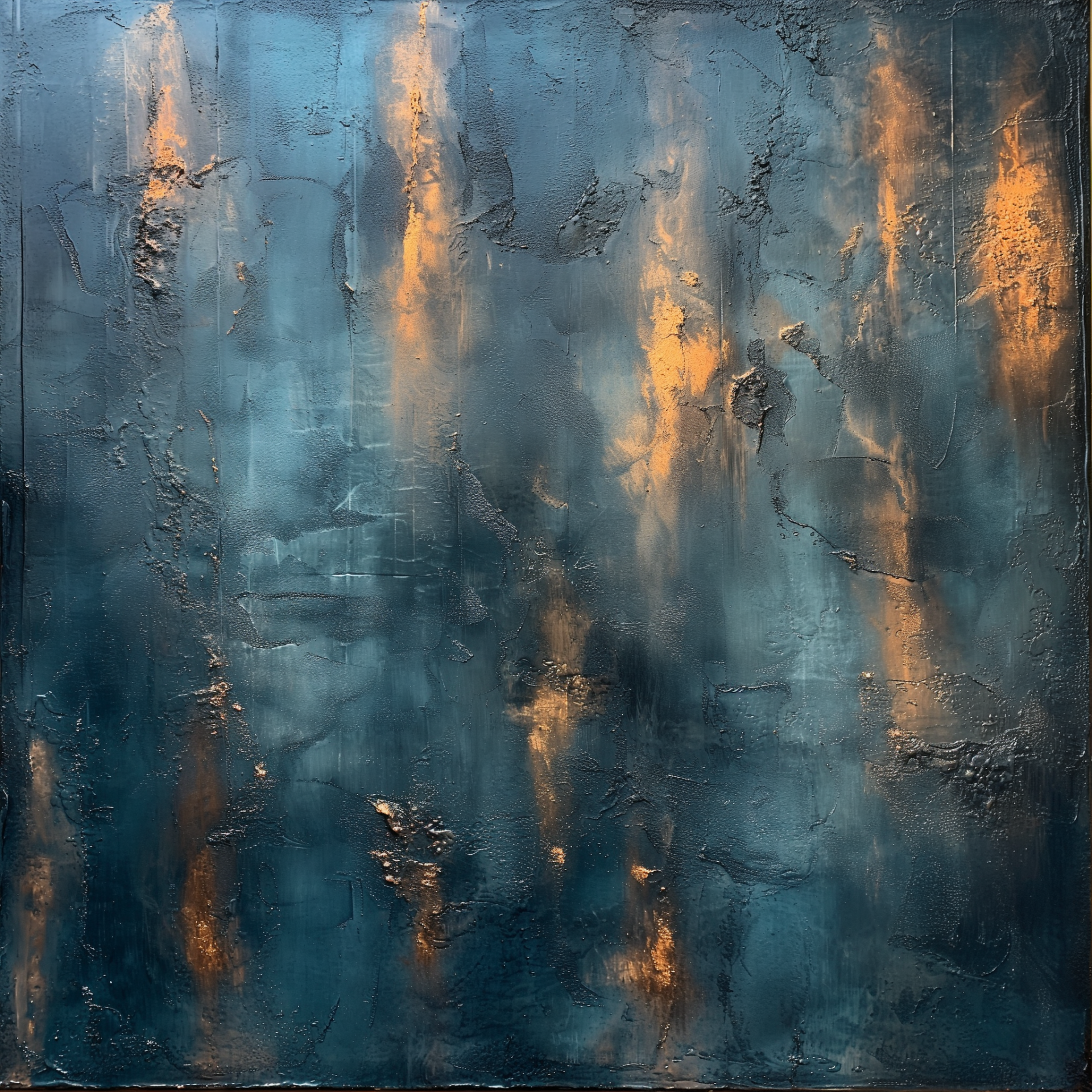 This painting features vibrant shades of blue, teal, and copper, creating a dynamic, abstract composition. The swirling patterns and textures evoke a sense of movement and energy, inviting viewers to explore its depths.