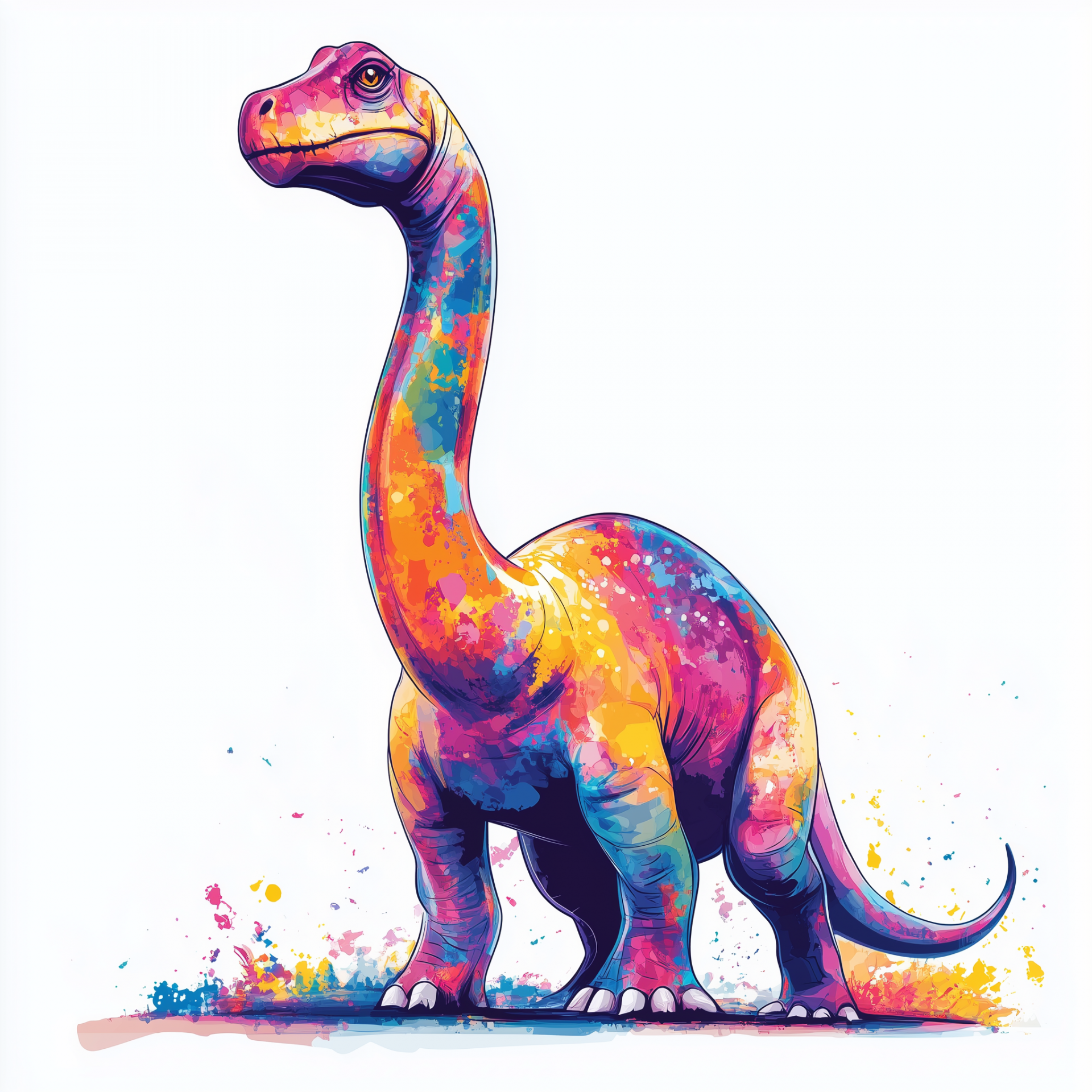 This illustration features a vibrant Brontosaurus against a clean white background. The use of vivid colors makes the dinosaur stand out, creating a playful and lively atmosphere.