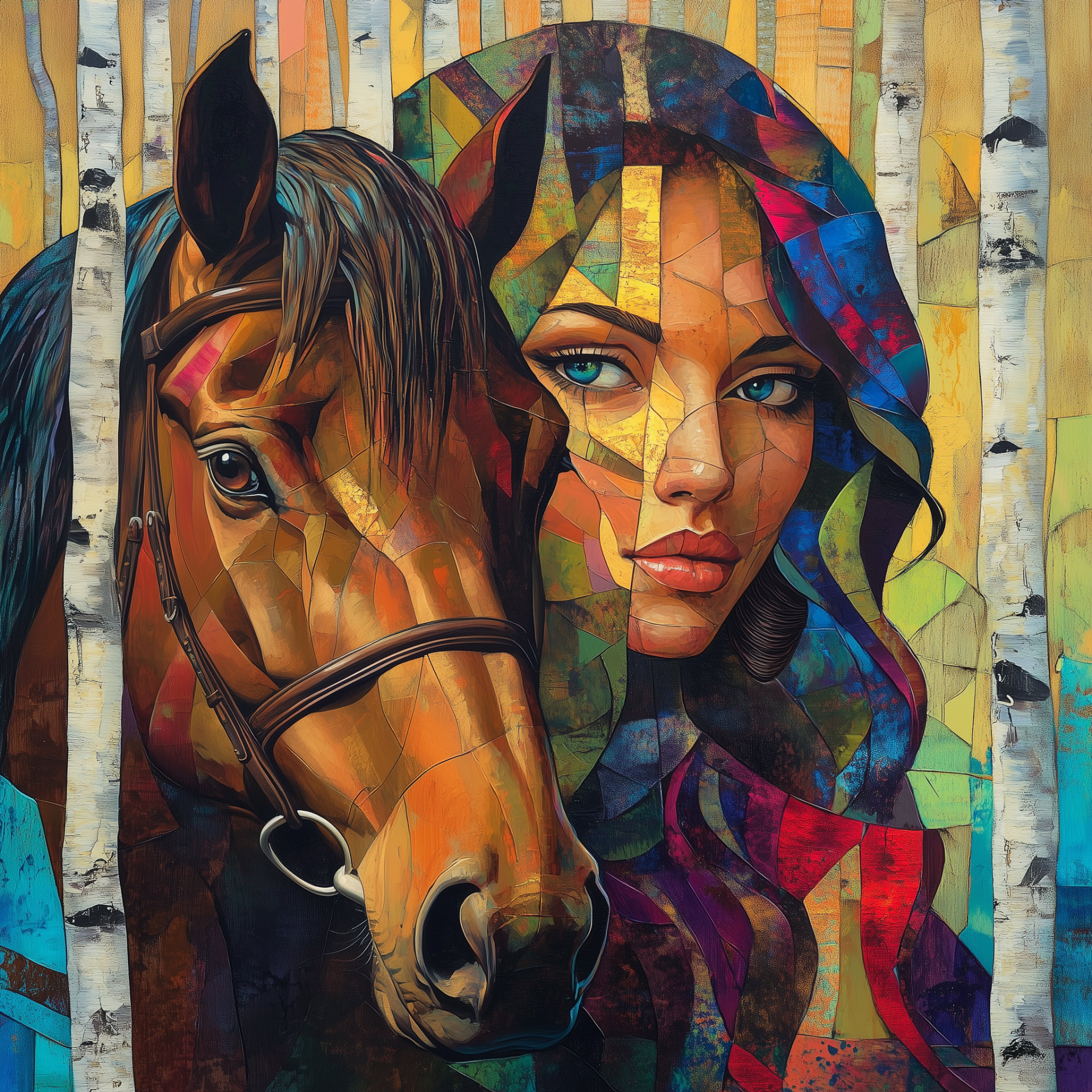 The painting exudes fierce energy, featuring a stunning woman and her beautiful brown horse set against a backdrop of birch trees. Bright colors and dynamic brushstrokes create a lively and expressive atmosphere, emphasizing the bond between the two subjects.