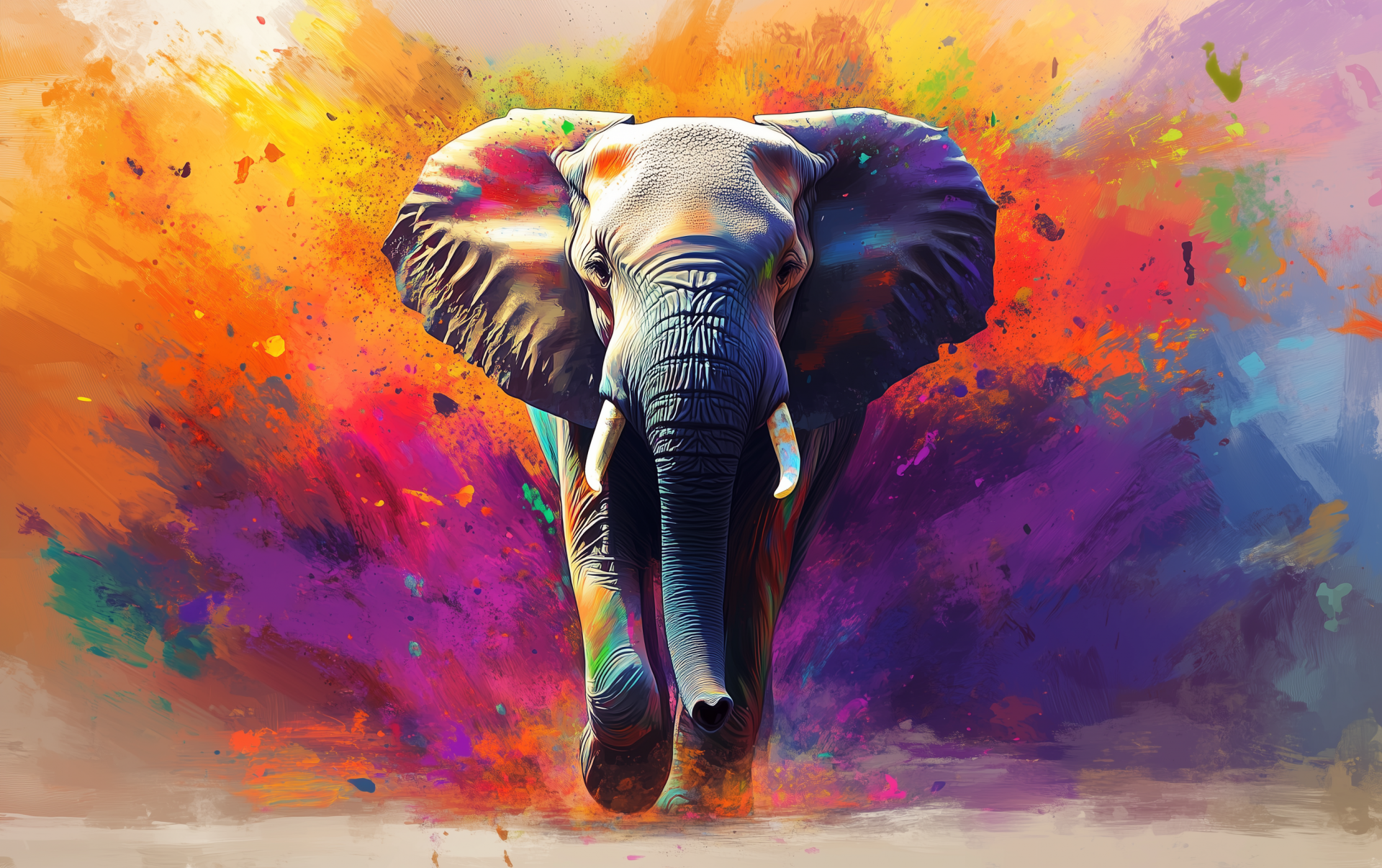 This artwork features a majestic elephant moving gracefully through a vivid explosion of colors. The expressive brush strokes and dynamic splashes create a powerful and captivating composition.