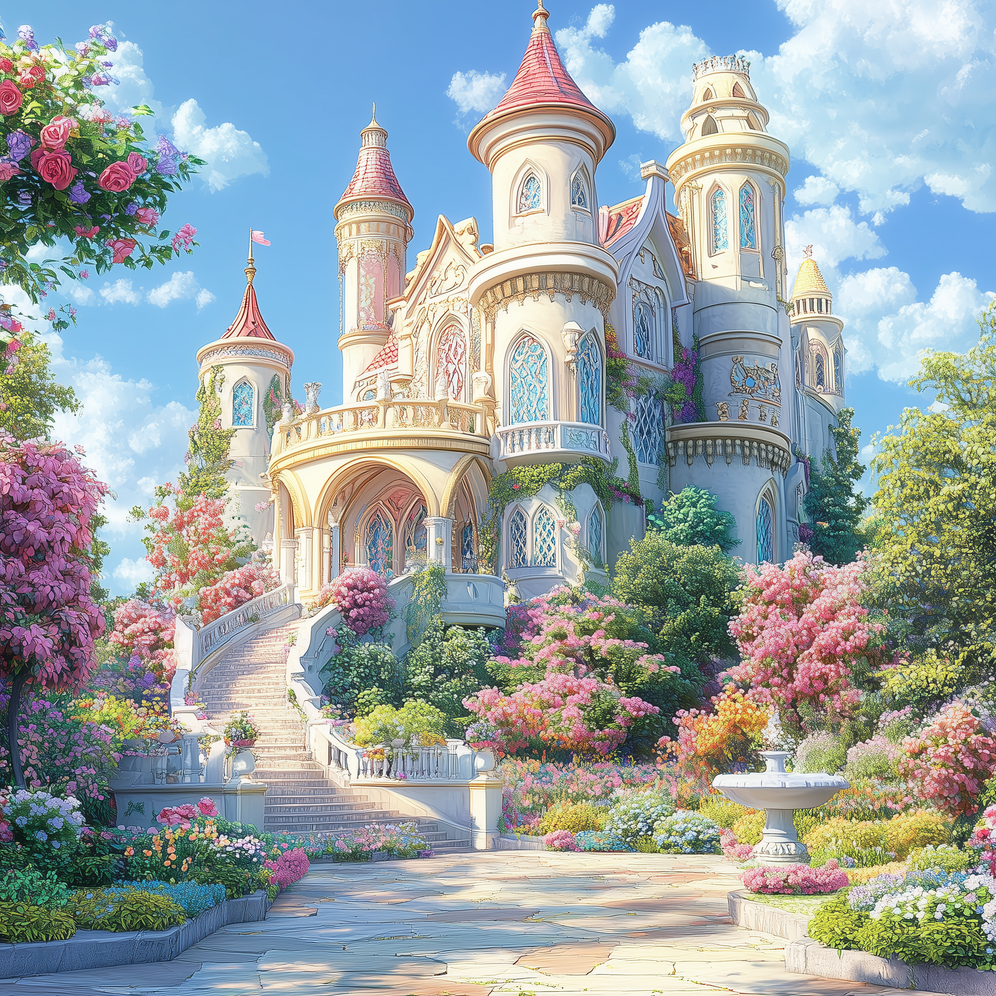 This image showcases a vibrant and colorful 3D digital illustration of a fairytale castle. The castle features pastel colors, intricate arches, and is surrounded by lush blooming gardens under a clear blue sky.
