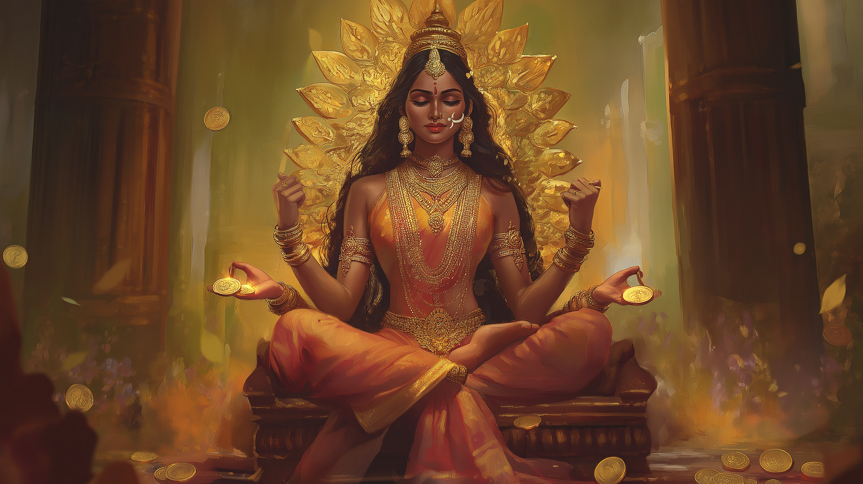 This vibrant oil painting features the goddess Mahalaxmi sitting gracefully on a lotus amidst golden coins. The dynamic colors and pleasant expression create a sense of joy and divinity in the artwork.