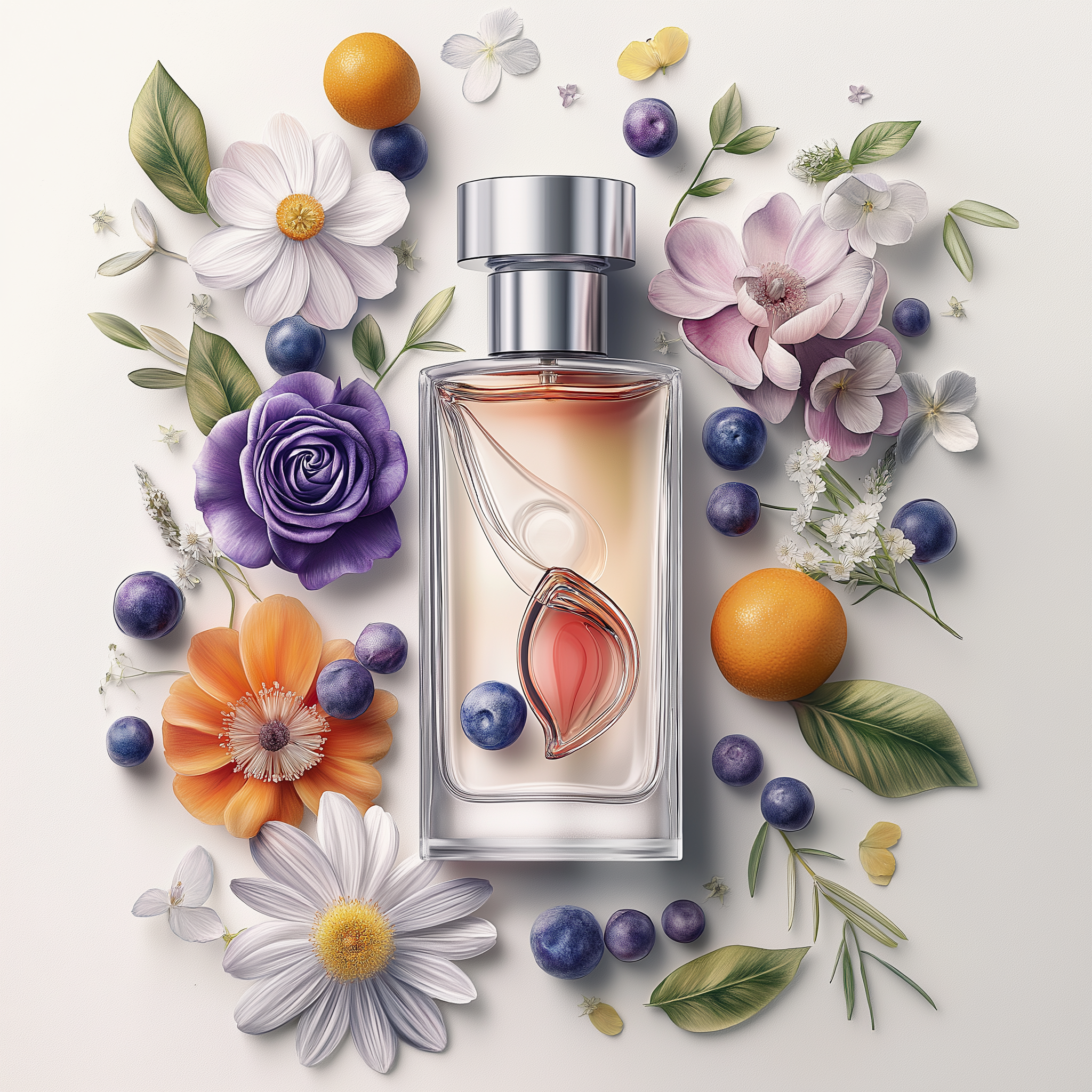 The illustration features a beautifully drawn perfume bottle nestled among a vibrant array of purple flowers and fruits. The use of colored pencils adds a soft and artistic touch, enhancing the overall aesthetic of the image.