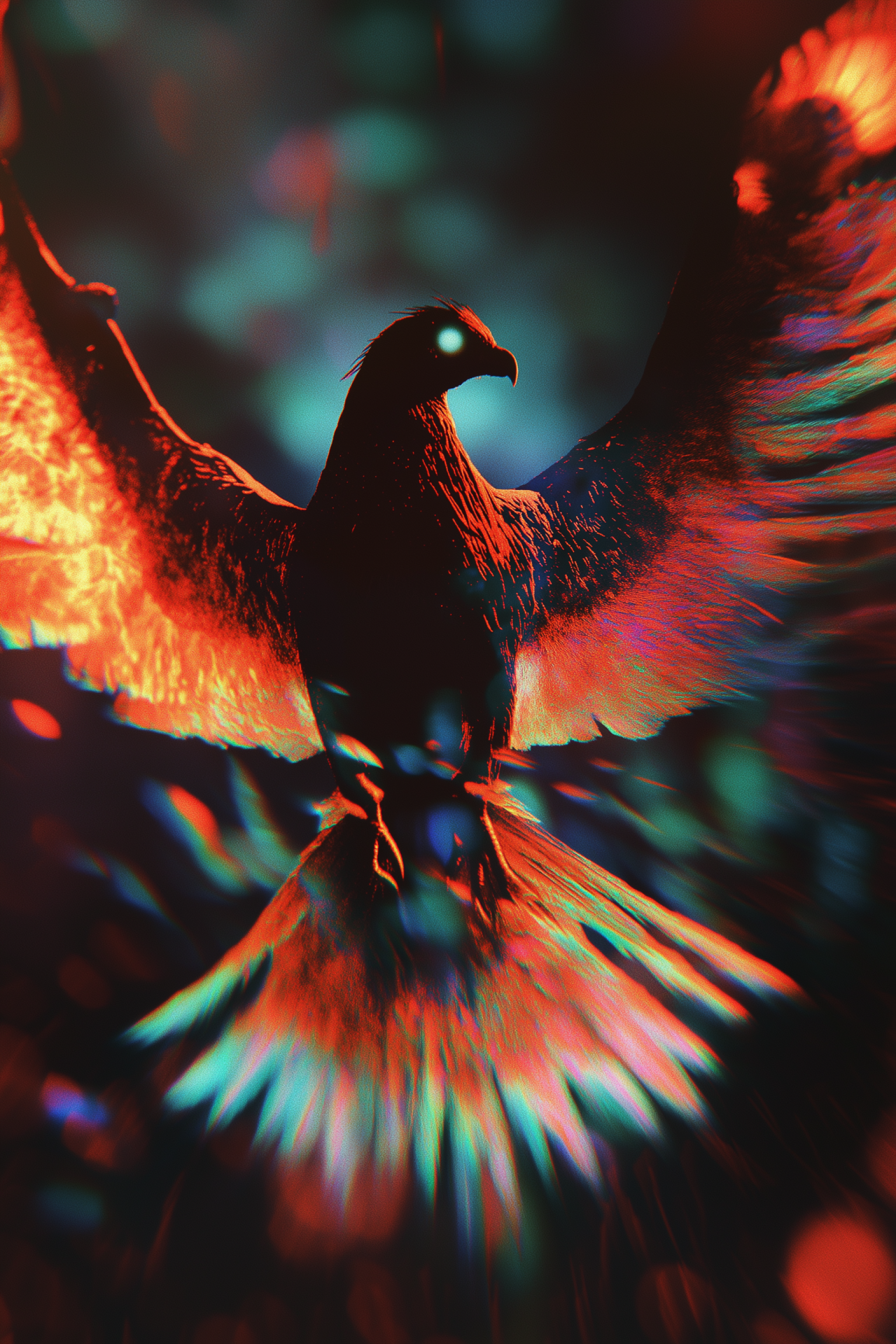 The image presents a vibrant and dynamic silhouette of a phoenix rising amidst a swirl of colorful flames. The psychedelic art style enhances the feeling of energy and transformation, captivating the viewer with its bold colors and intricate design.