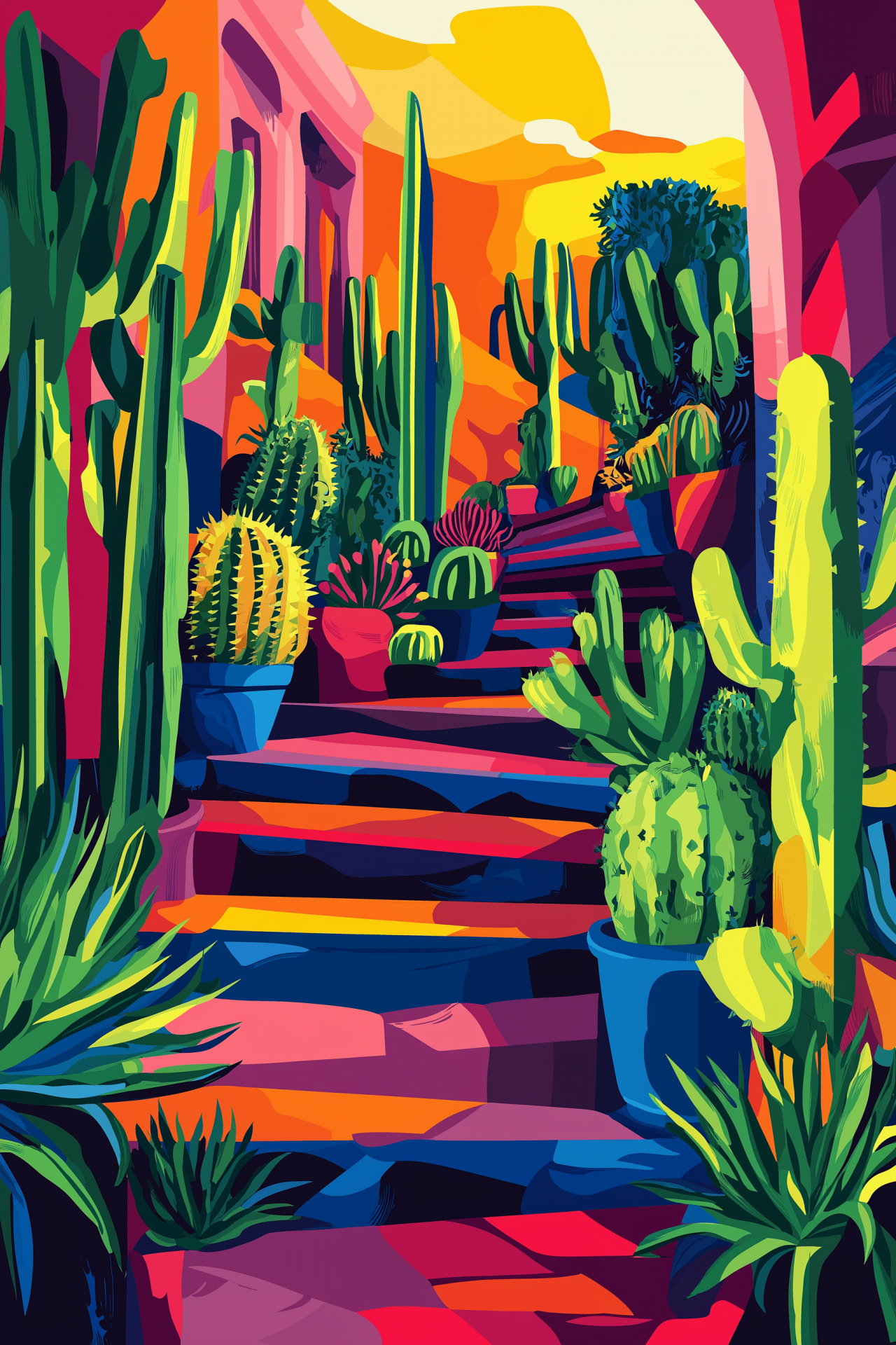 This vibrant vector art showcases a colorful stairwell filled with a variety of cacti in different sizes. The playful design and bold colors create a lively and inviting atmosphere.