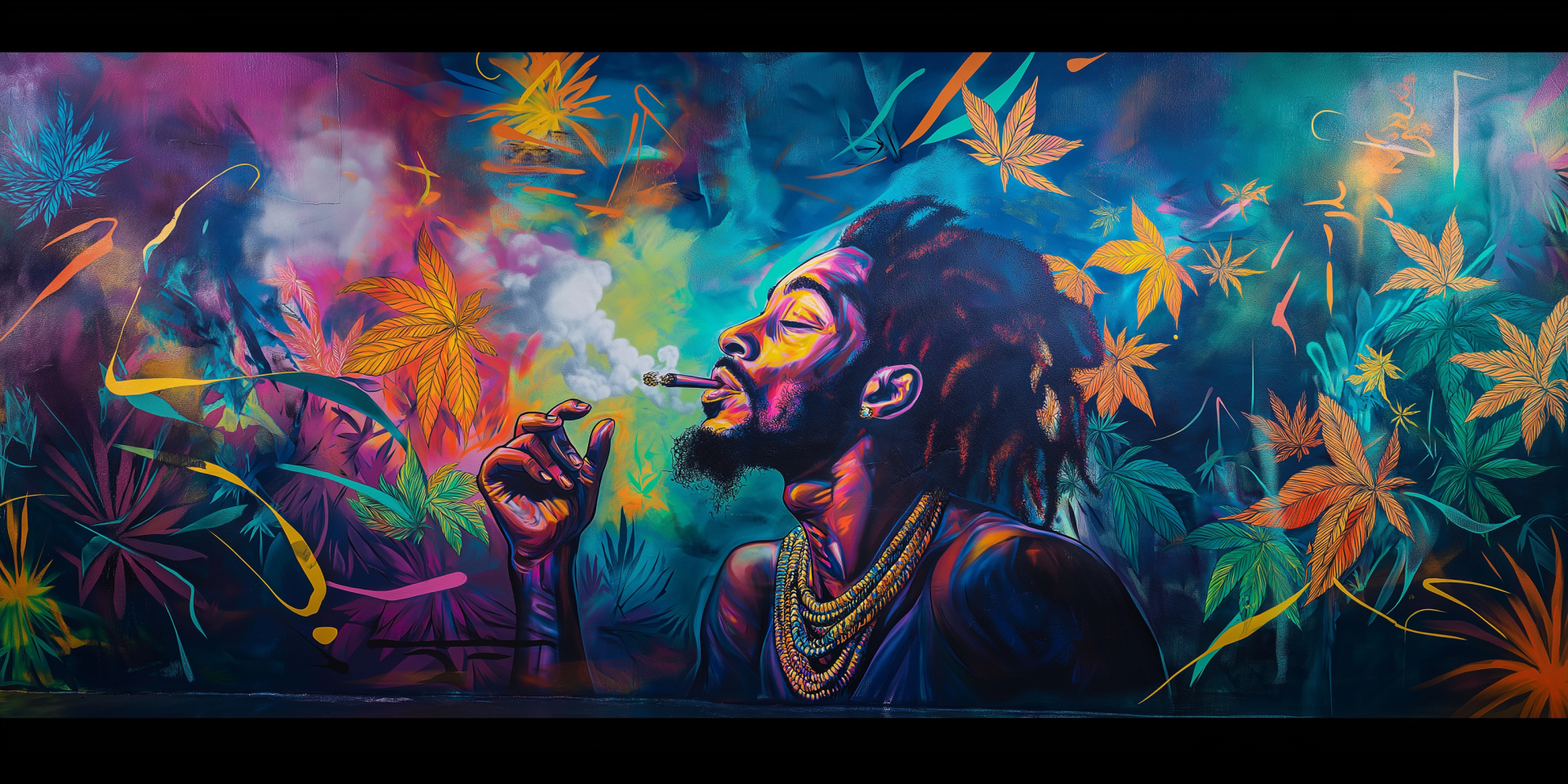 This image showcases a large, colorful mural depicting a Jamaican African American Rastafarian figure in a lively nighttime setting. The vibrant hues and dynamic composition evoke a sense of energy and cultural pride, reminiscent of bold artistic styles.