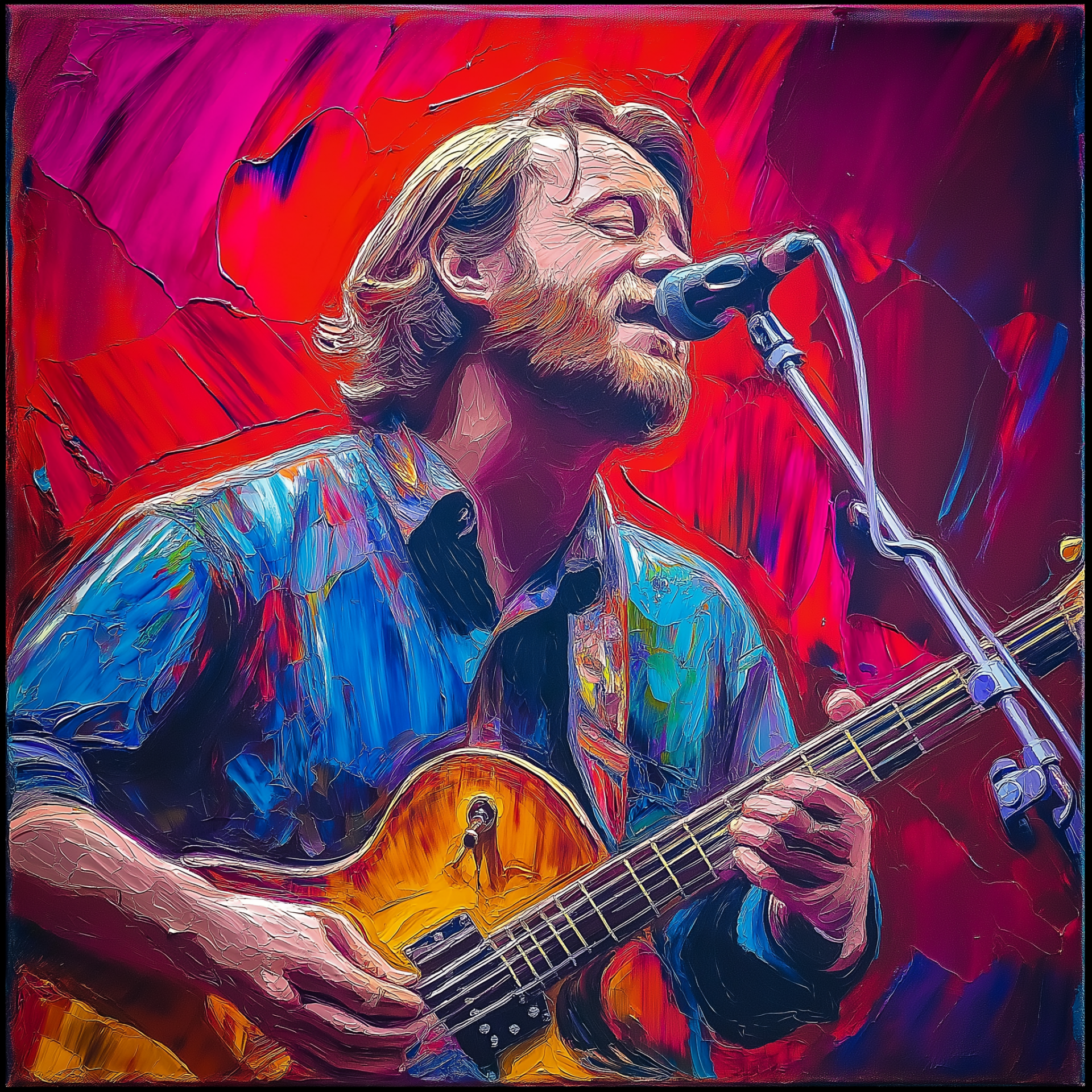 The artwork features thick, heavy impasto techniques that create a rich texture, inviting the viewer to visually explore the depth of the paint. Bursting with vibrant colors, the painting offers an energetic and lively atmosphere, showcasing bold brush strokes that enhance its dynamic quality.