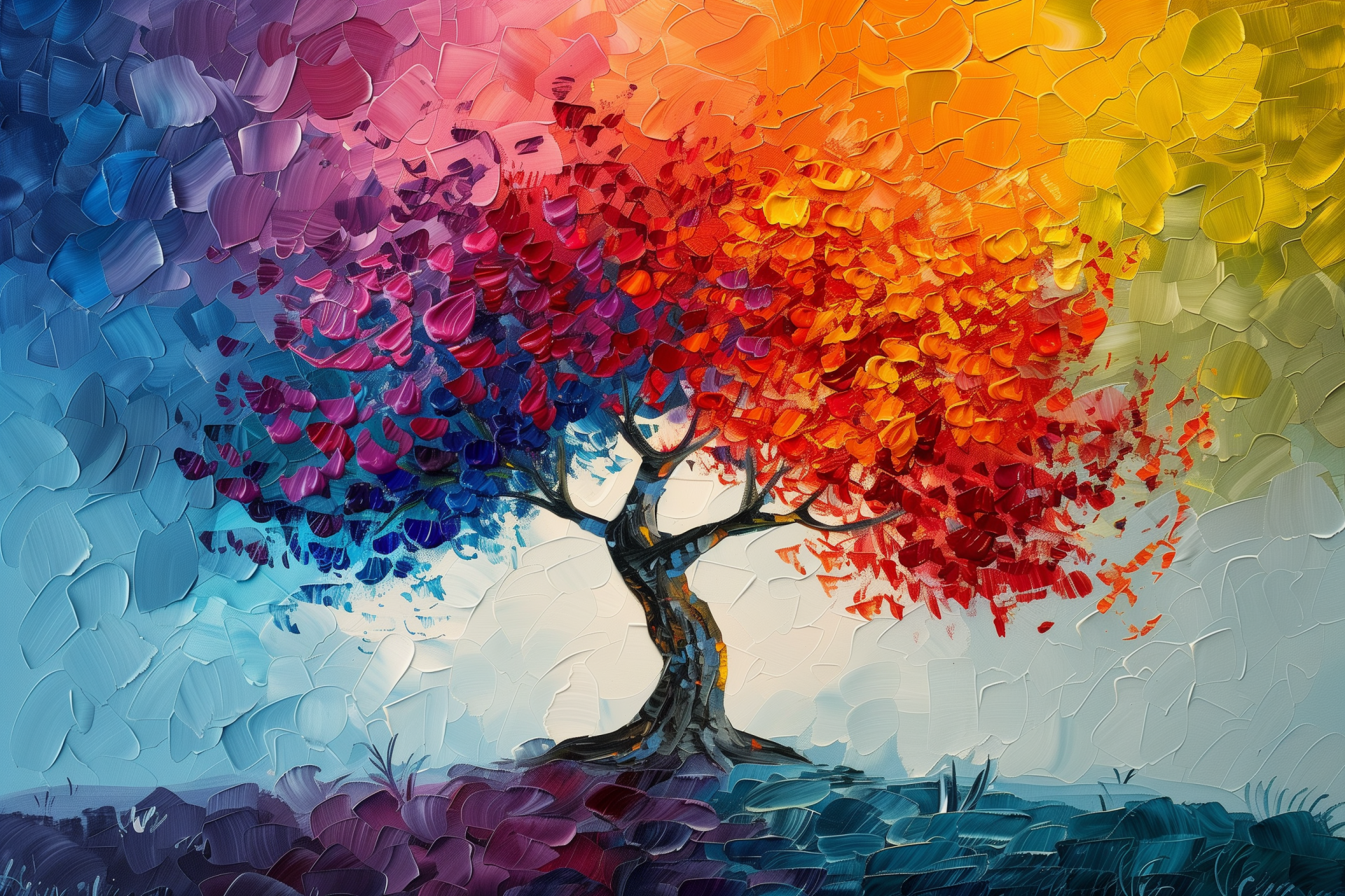 This image features a vibrant and colorful Tree of Life painted in a thick impasto oil style. Bold and expressive brushstrokes create rich texture and depth throughout the foliage.