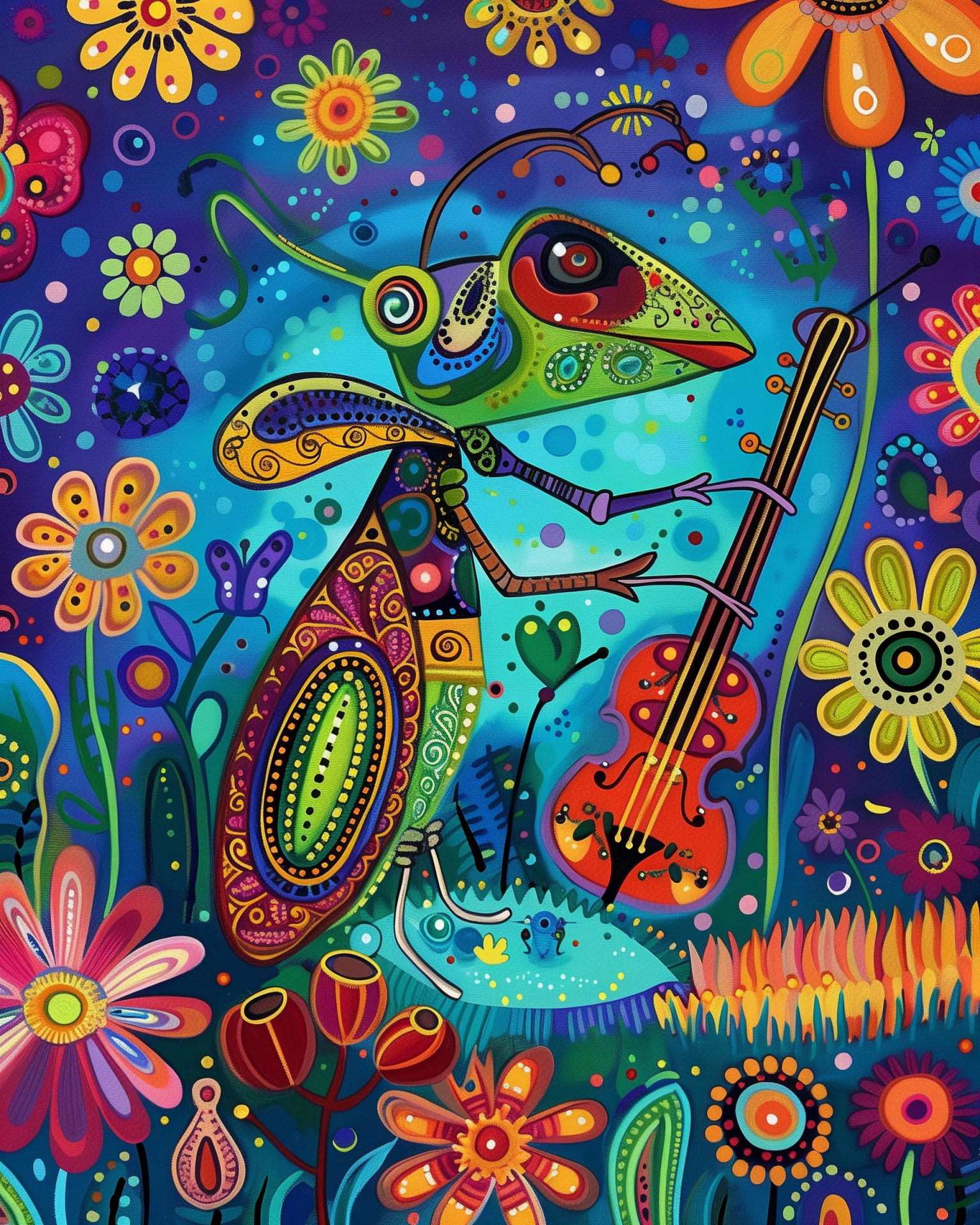 This illustration features a whimsical grasshopper playing the violin amidst a vibrant, patterned meadow. The scene is rich with colorful flowers and decorative textures, creating a joyful and folk art-inspired atmosphere.