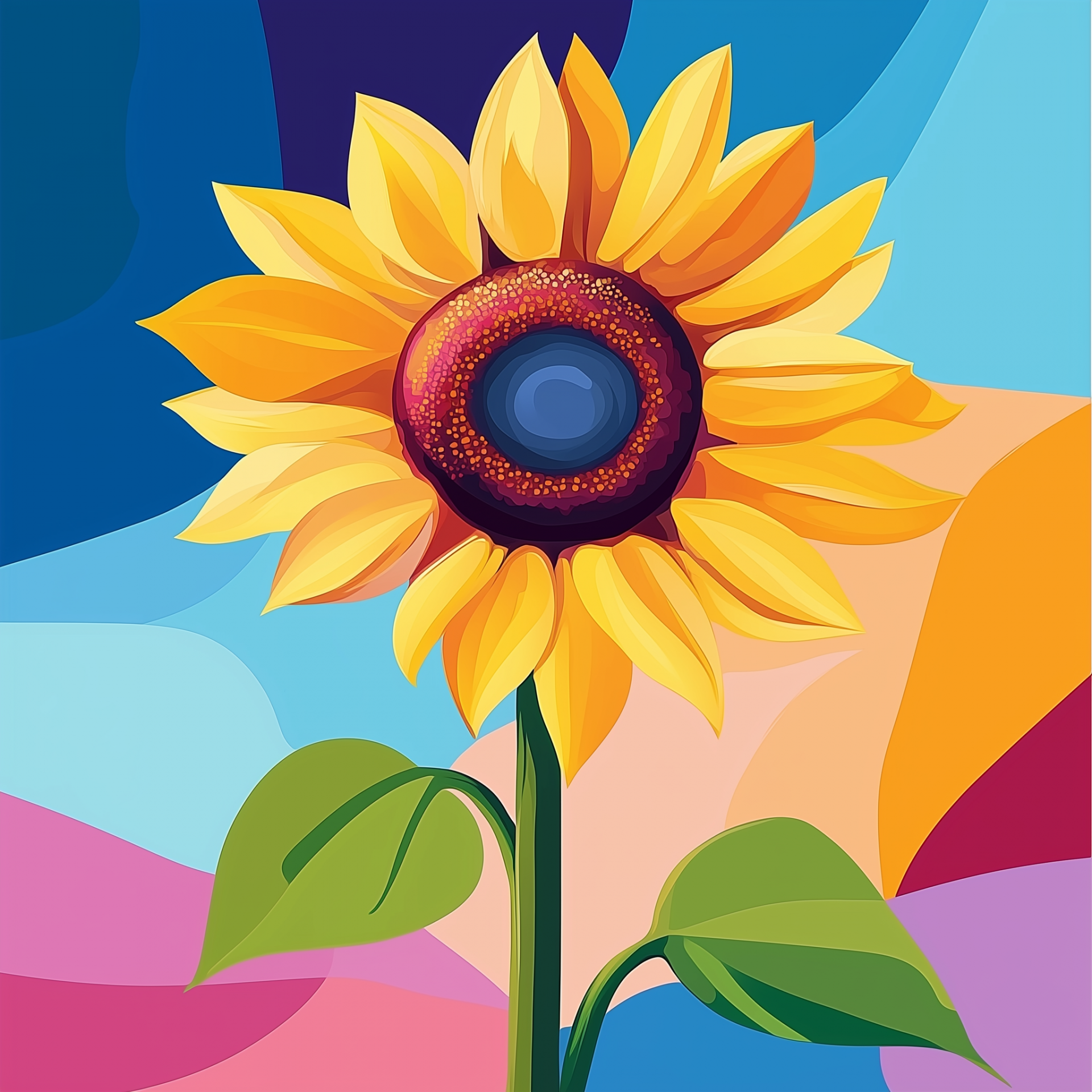 This image showcases a sunflower created in a lively vector art style, surrounded by a background of bold geometric shapes. The vibrant colors evoke a sense of elegance and playfulness, making it suitable for various creative applications.
