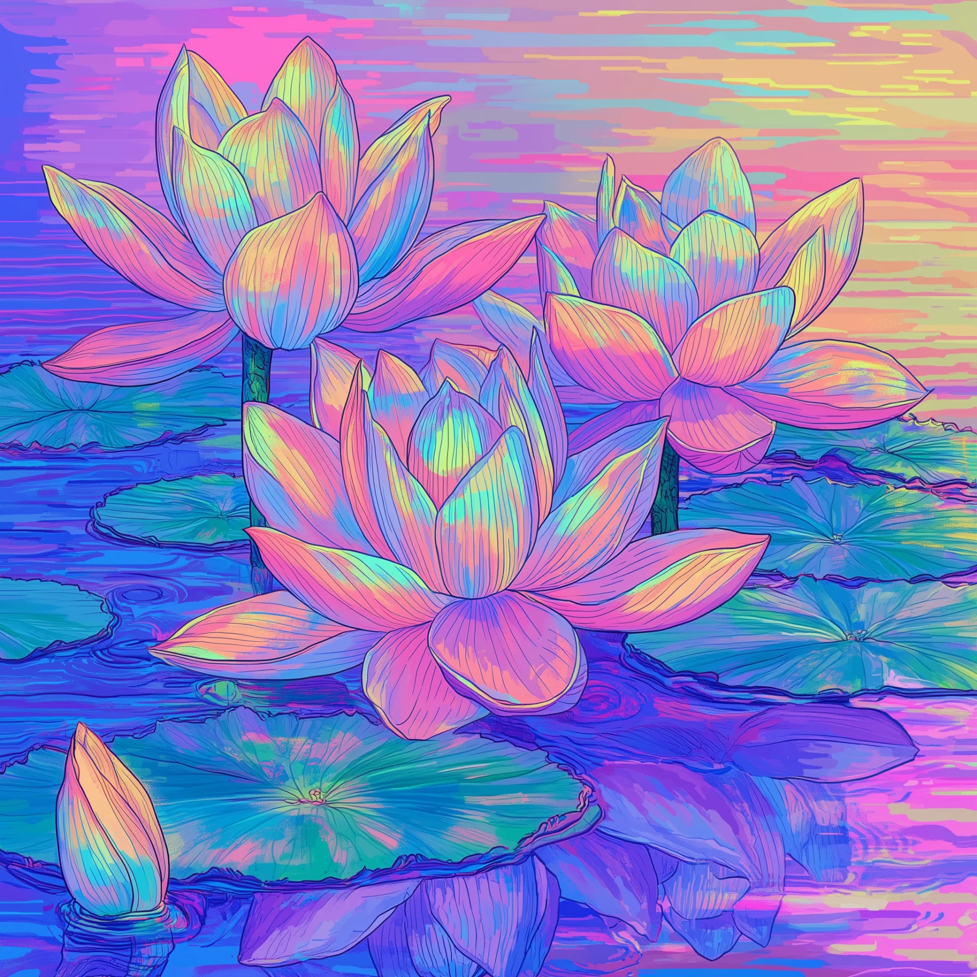 A playful cartoon illustration of a baby dragon with cute horns and wings, sitting by the serene shore of a lake. The background is white, highlighting the vibrant details of water lilies floating on the water.