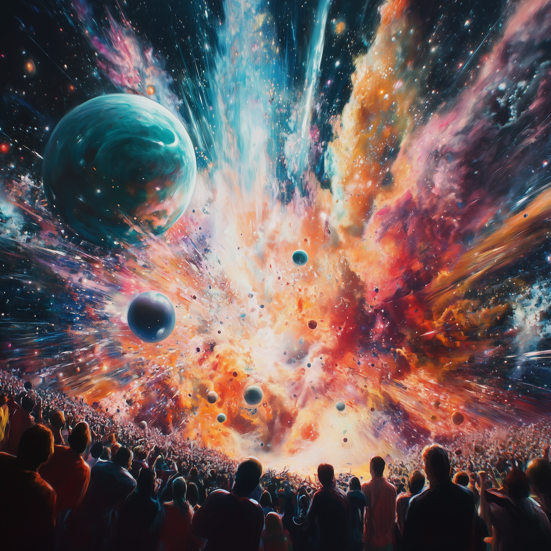The image features a vibrant and dynamic explosion of colors representing a universe filled with planets and stars. Crowds of people can be seen joyfully cheering, captivated by the cosmic display above them.