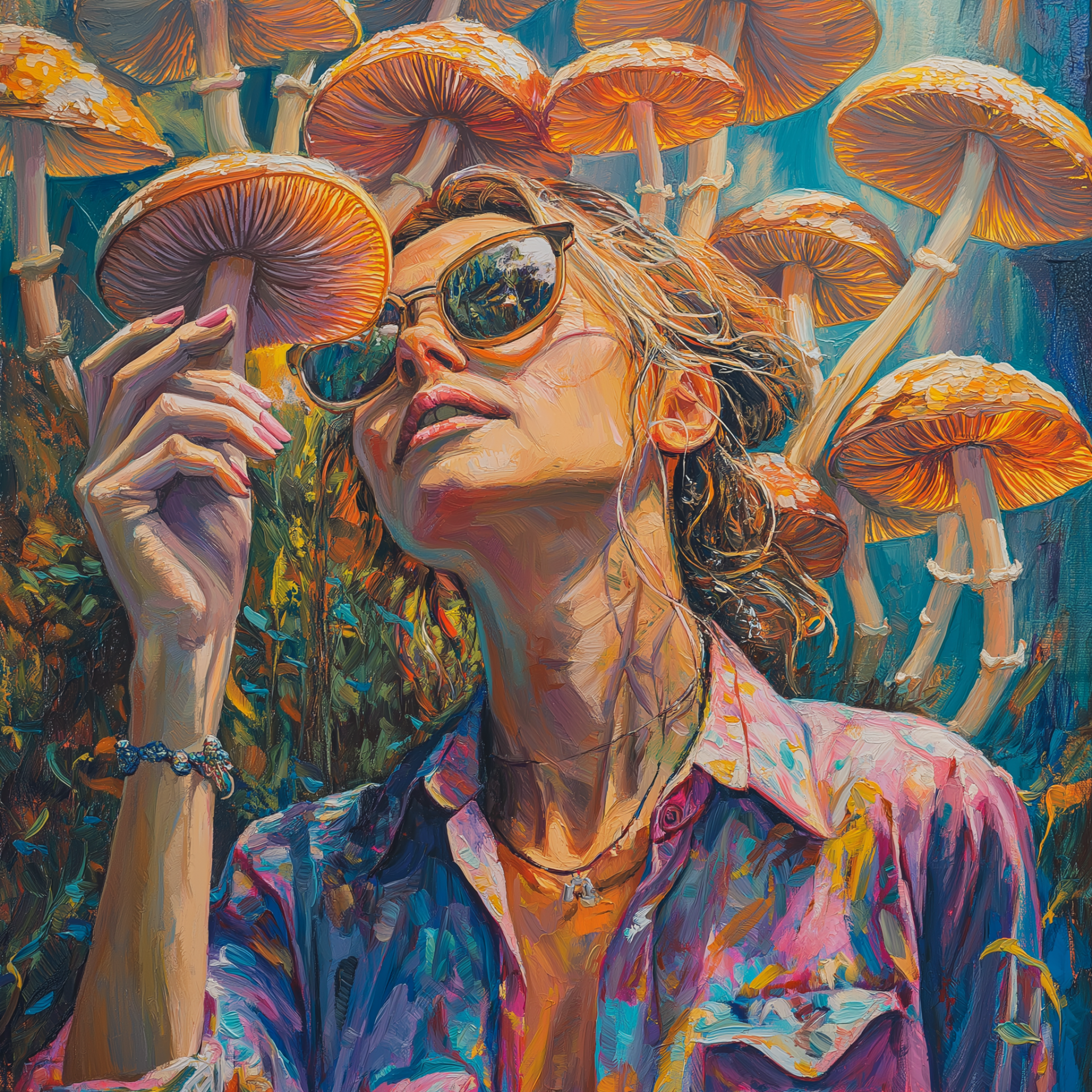 The image features an adult woman confidently holding long-stemmed mushrooms high above her head, with a proud expression on her face. The background is abstract and colorful, enhancing the photo-realistic quality of the scene.