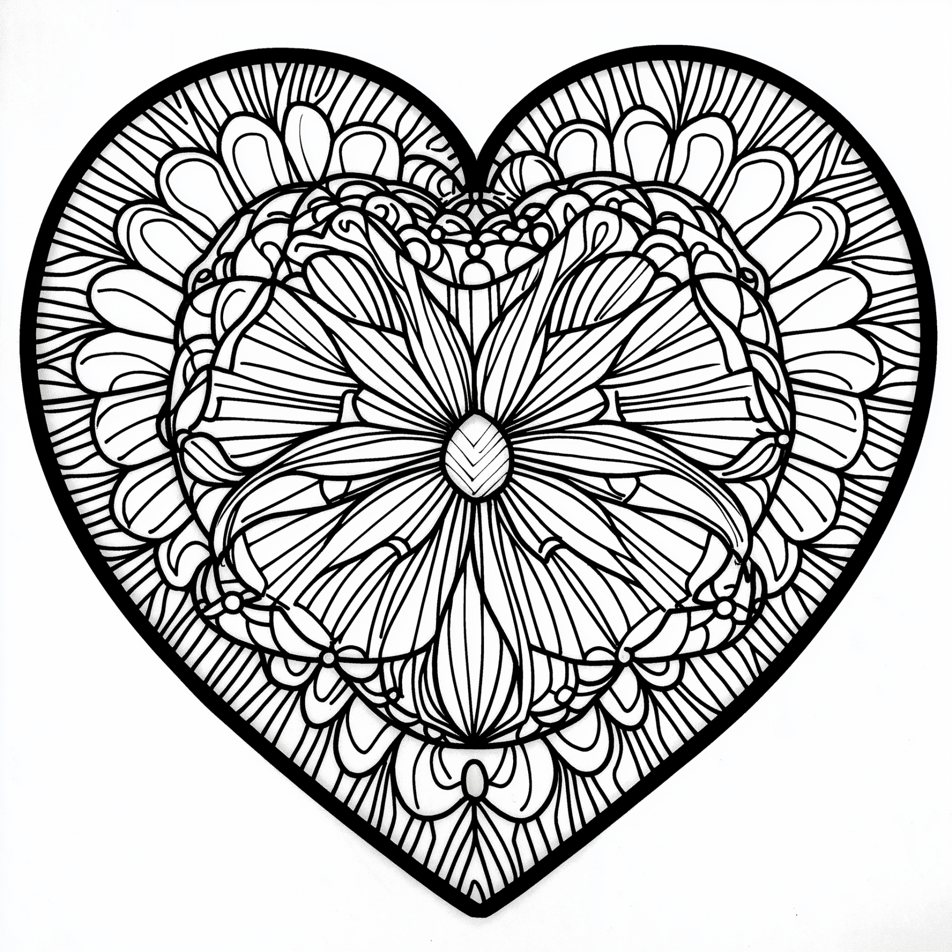 This image features a full-page mandala design shaped like a heart, intricately detailed with various patterns and shapes. The overall look invites creativity and relaxation, perfect for a coloring activity.