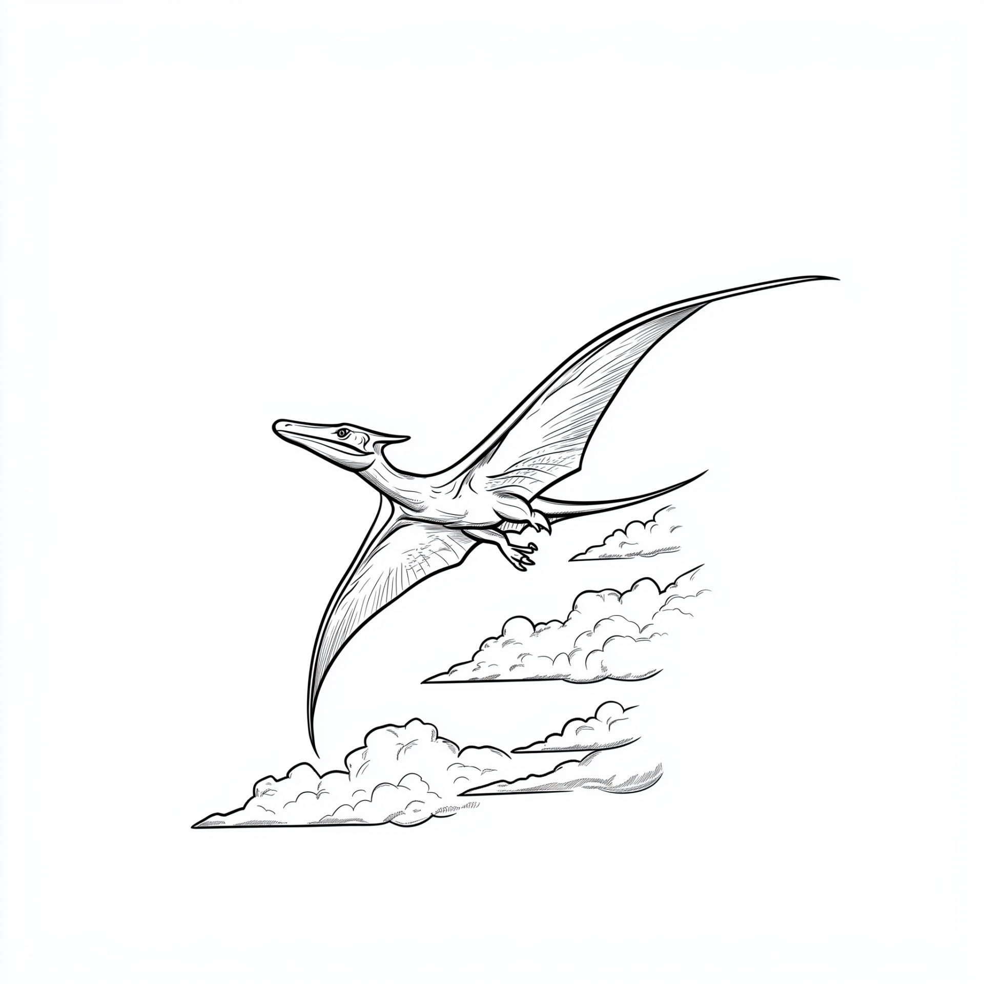 This image features a whimsical cartoon pterodactyl soaring in a clear blue sky. The design is outlined with thick black lines and is perfect for kids to color, emphasizing simplicity and fun.