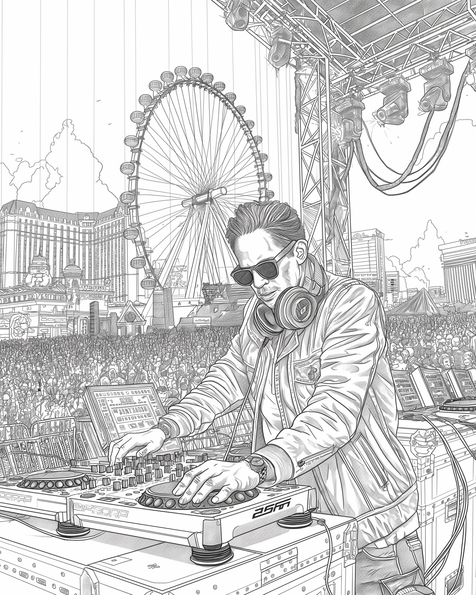 This illustration depicts a monochromatic scene featuring a DJ performing at a vibrant music festival. The towering DJ booth is surrounded by an enthusiastic crowd, illuminated by LED panels and large speakers, all devoid of color for creative coloring.