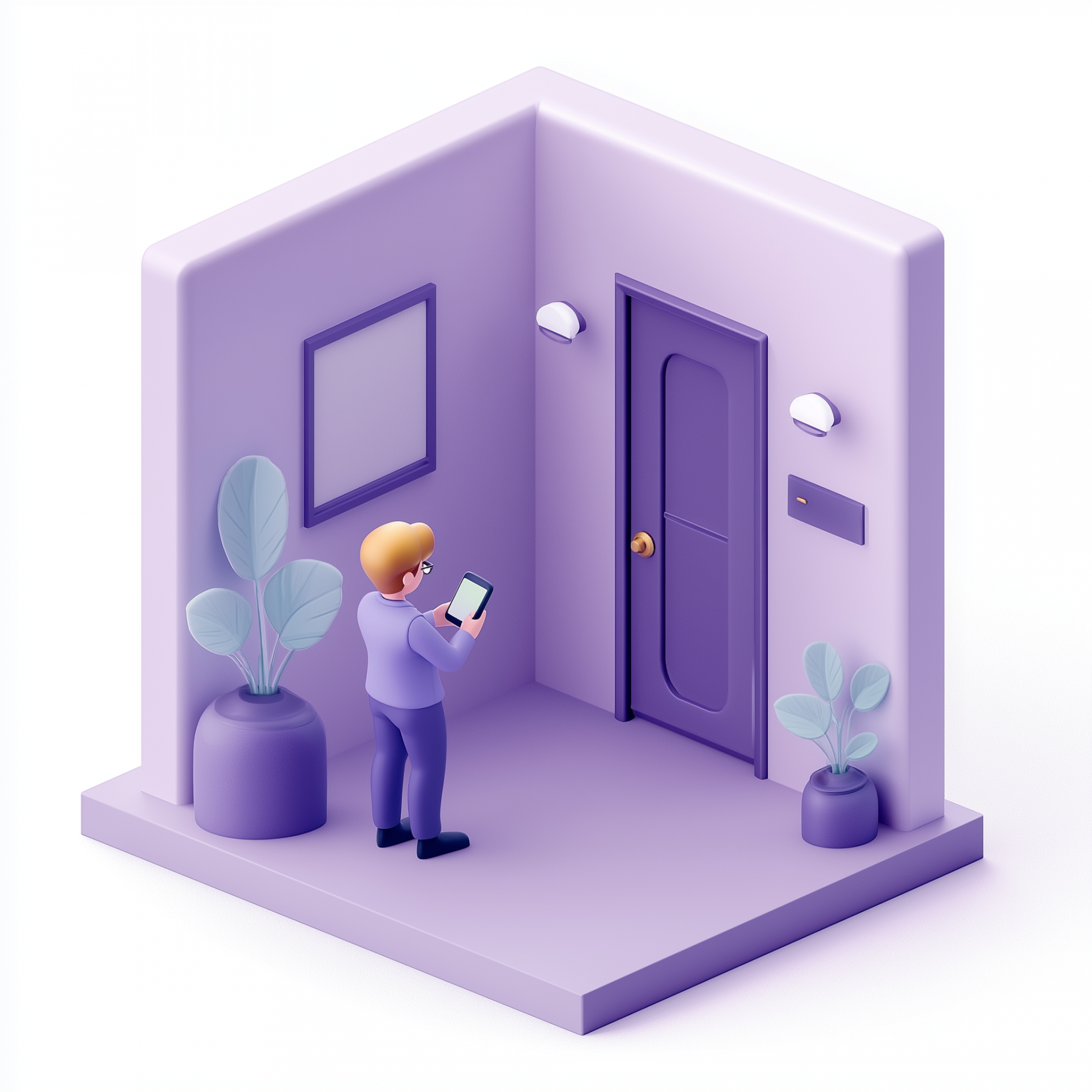 The image showcases an isometric view of a welcoming hotel room, filled with light purple tones that enhance its inviting atmosphere. A hotel employee stands next to a door, engrossed in his mobile phone, adding a touch of modernity to the serene setting.