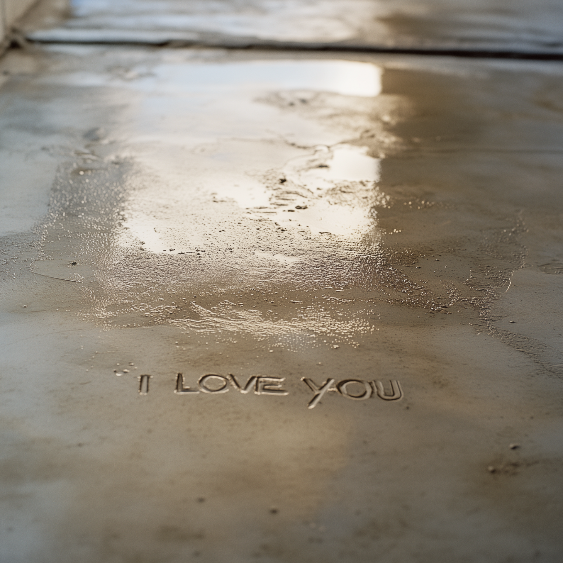 The image features a message of love delicately etched into a flat surface of drying concrete. The simplicity of the inscription against the gray texture evokes a sense of permanence and affection.