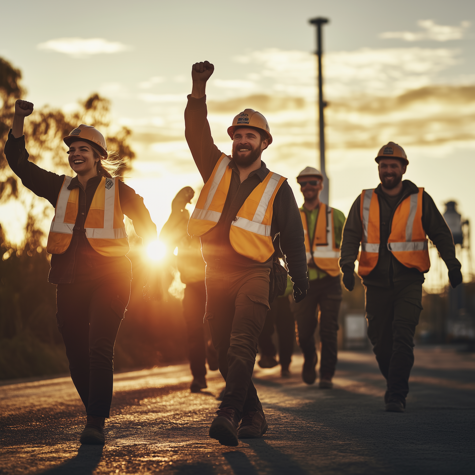 The image captures a diverse team of tradies, both men and women, engaged in their work on a construction site. They are dressed in safety gear and appear focused and collaborative, reflecting a sense of teamwork and professionalism.