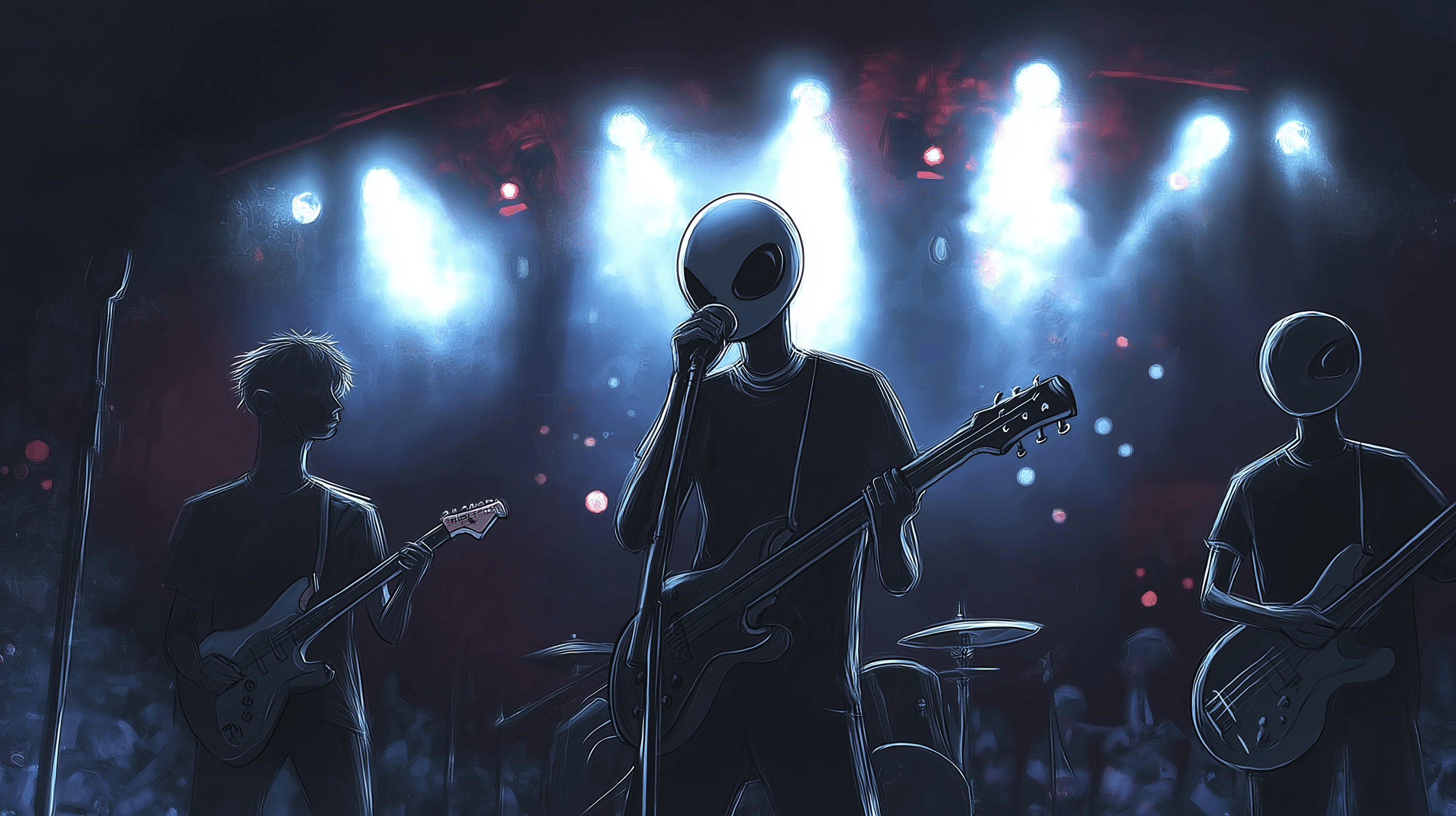 The image features a lively sketch of an alien singing passionately into a microphone, surrounded by a rock band playing guitars and drums. The warm stage lights create a dynamic and atmospheric environment, enhancing the energetic vibe of the performance.
