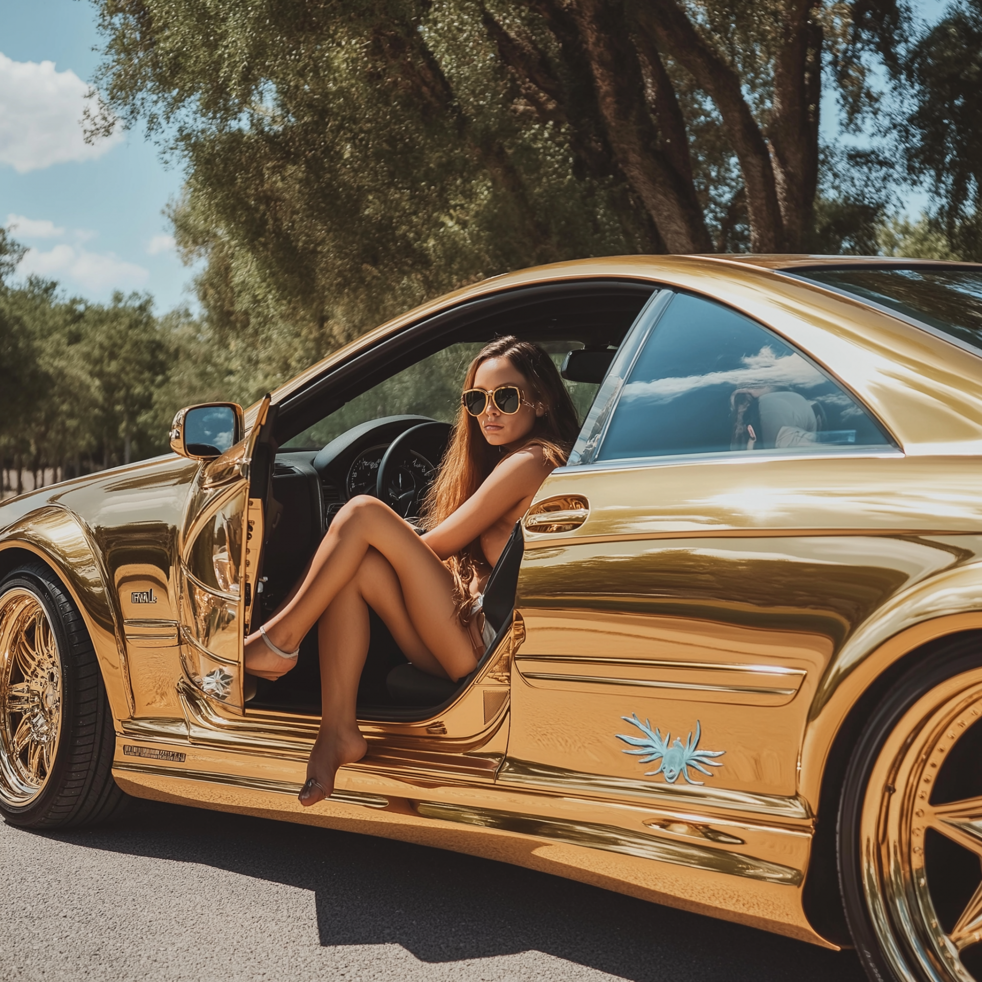 The image showcases a striking gold Mercedes CLK adorned with a unique Axolotl logo on its side door. A stylish brunette wearing sunglasses leans out of the driver's window, exuding a sense of confidence and flair.