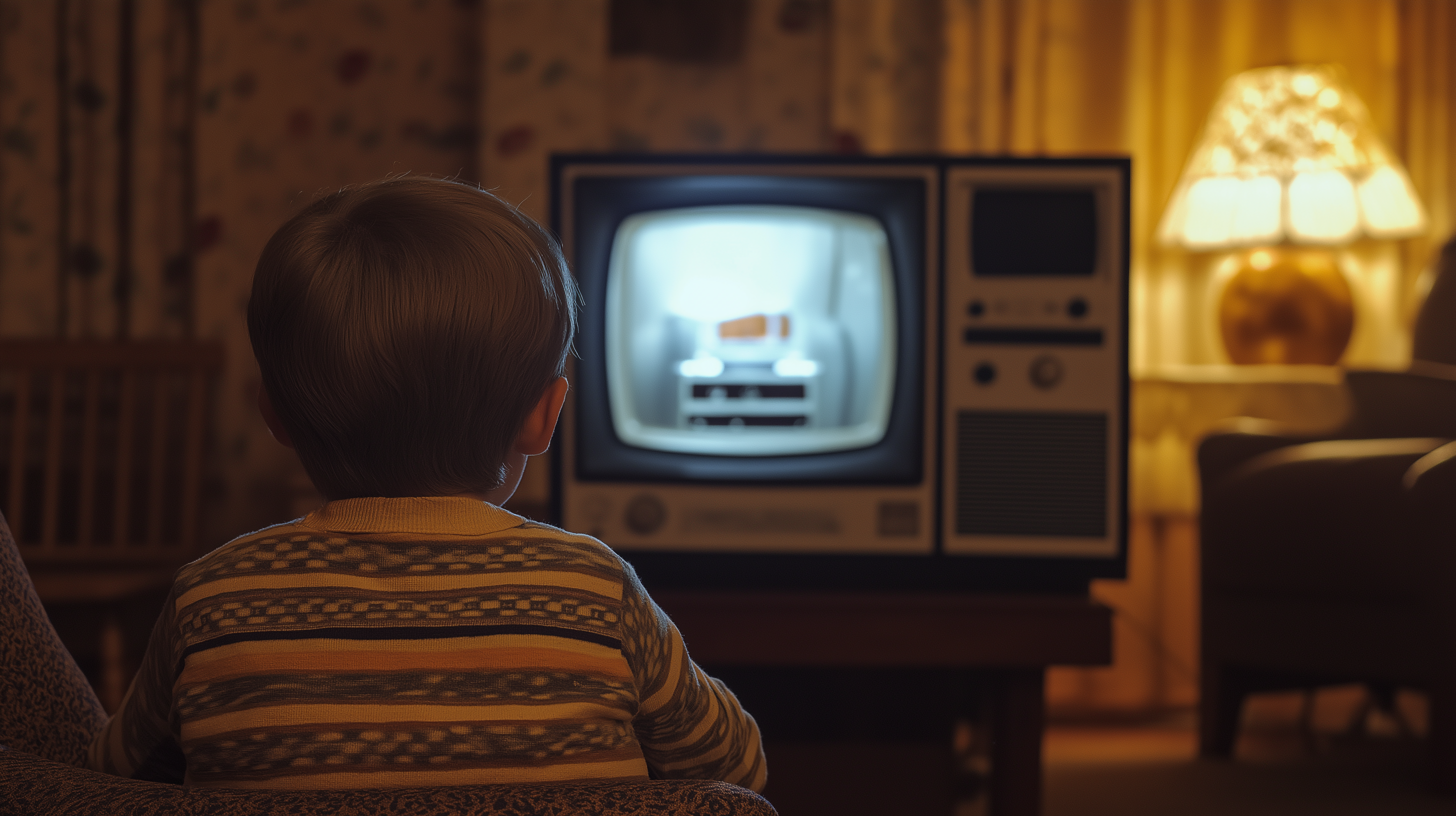 This image captures a little kid sitting in a cozy room, engrossed in a retro television show. The warm ambiance and 1980s decor evoke a sense of nostalgia and innocence.